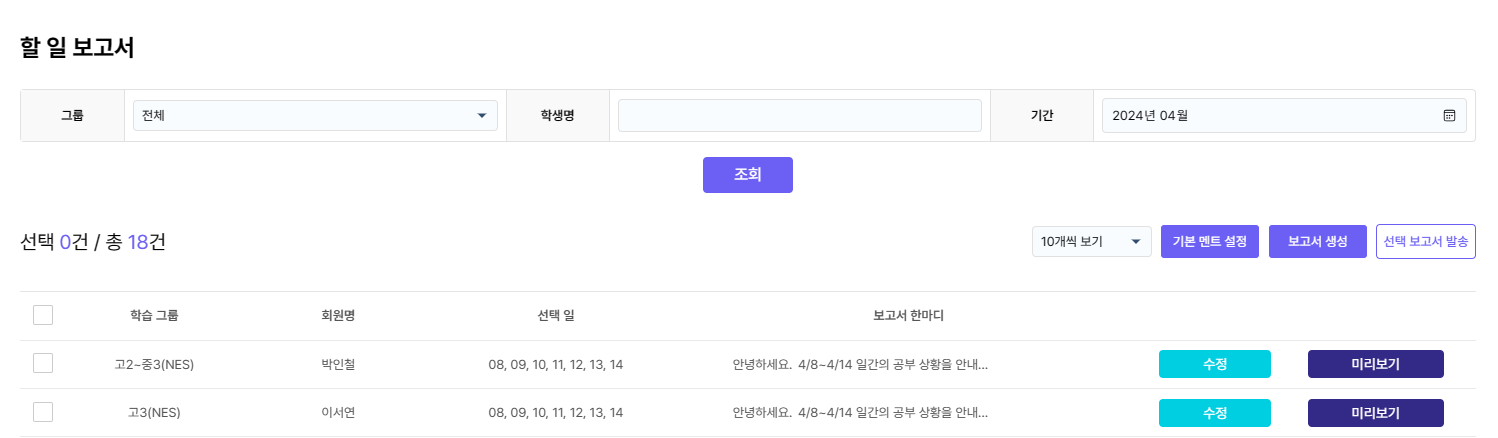 할 일 보고서 목록에서 [미리보기] 버튼을 누르면 할 일 보고서의 미리보기를 확인하고 발송도 할 수 있습니다.
