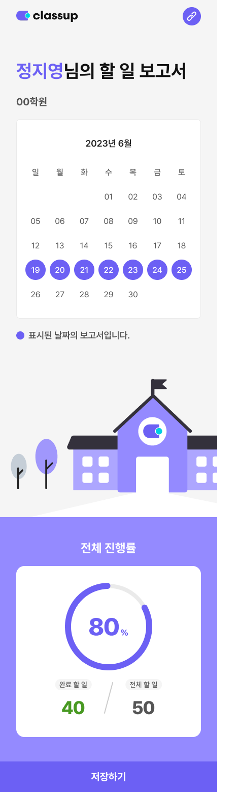 Q. 학부모님도 실시간으로 숙제를 볼 수 있나요? 학부모님께는 실시간 확인보다 더 효과적인 '할 일 보고서'를 발송해 드려요. 한 달 동안의 과제 수행률과 선생님의 꼼꼼한 코멘트가 담긴 리포트를 카카오톡으로 받아보실 수 있답니다.