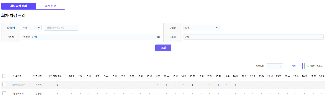 ์ข์ธก ์๋จ์ [ํ์ฐจ ์ฐจ๊ฐ ๊ด๋ฆฌ]์์ ํ์๋ค์ ์์ ์ฐจ๊ฐ ํ์๋ฅผ ์กฐํํด๋ณผ ์ ์์ต๋๋ค.