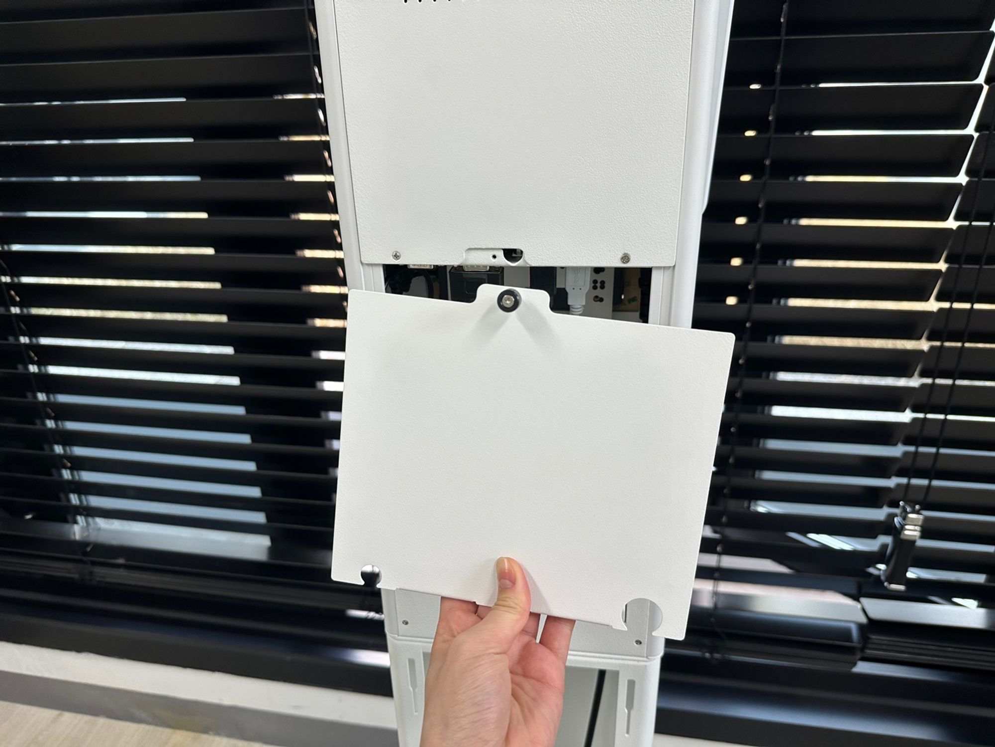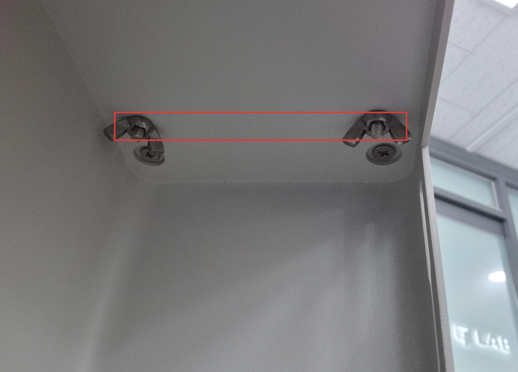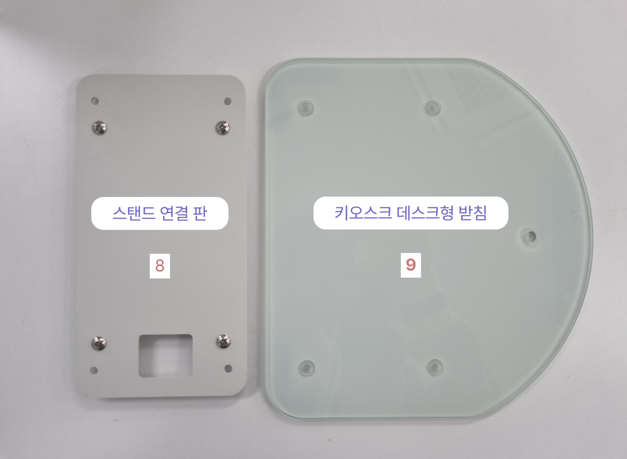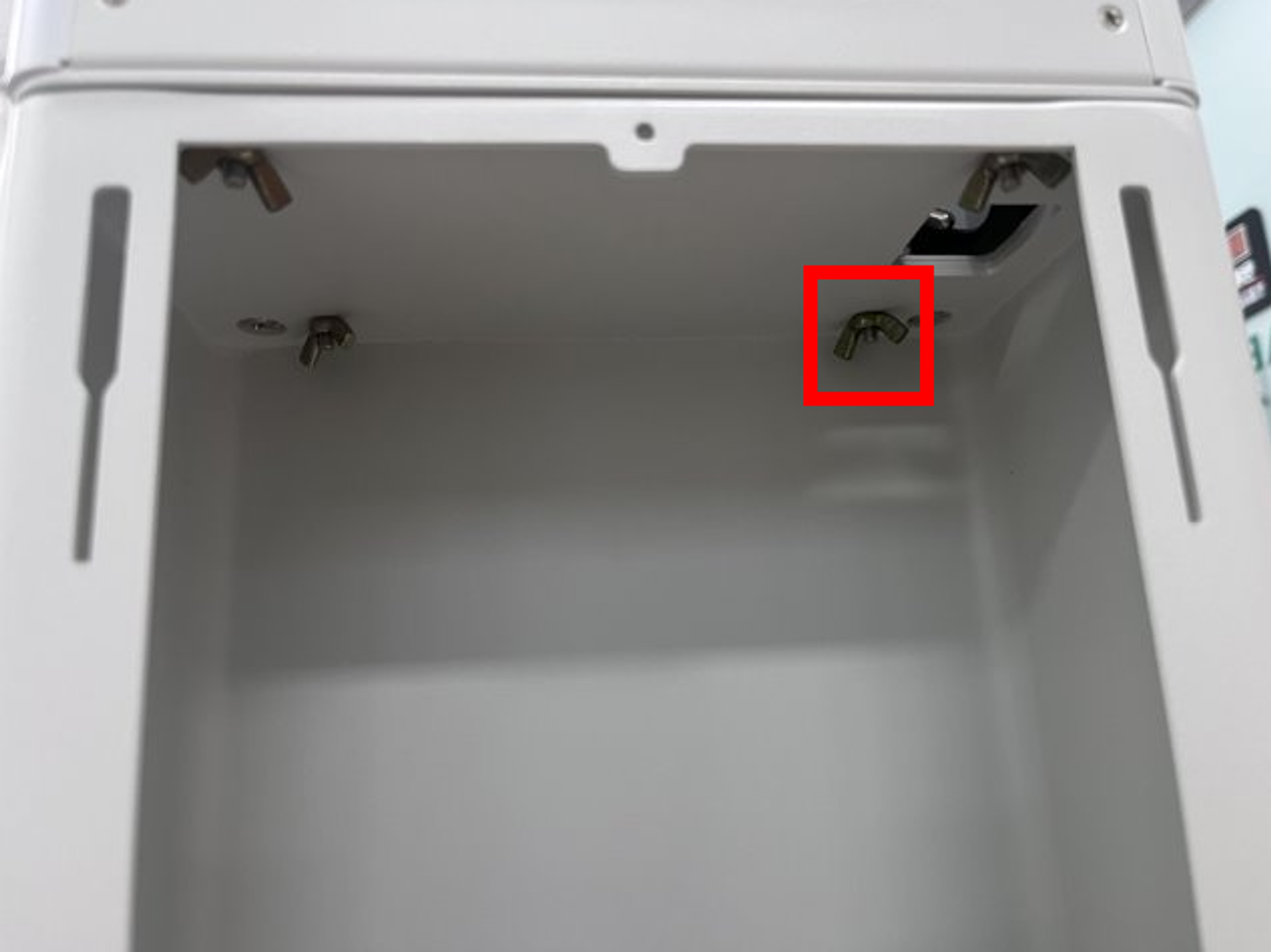 다음으로는 스탠드에 조립되어 있는 8번의 키오스크 안쪽 부분에 이미지의 빨간색 부분과 같이 조여진 나비 나사를 풀어주세요.