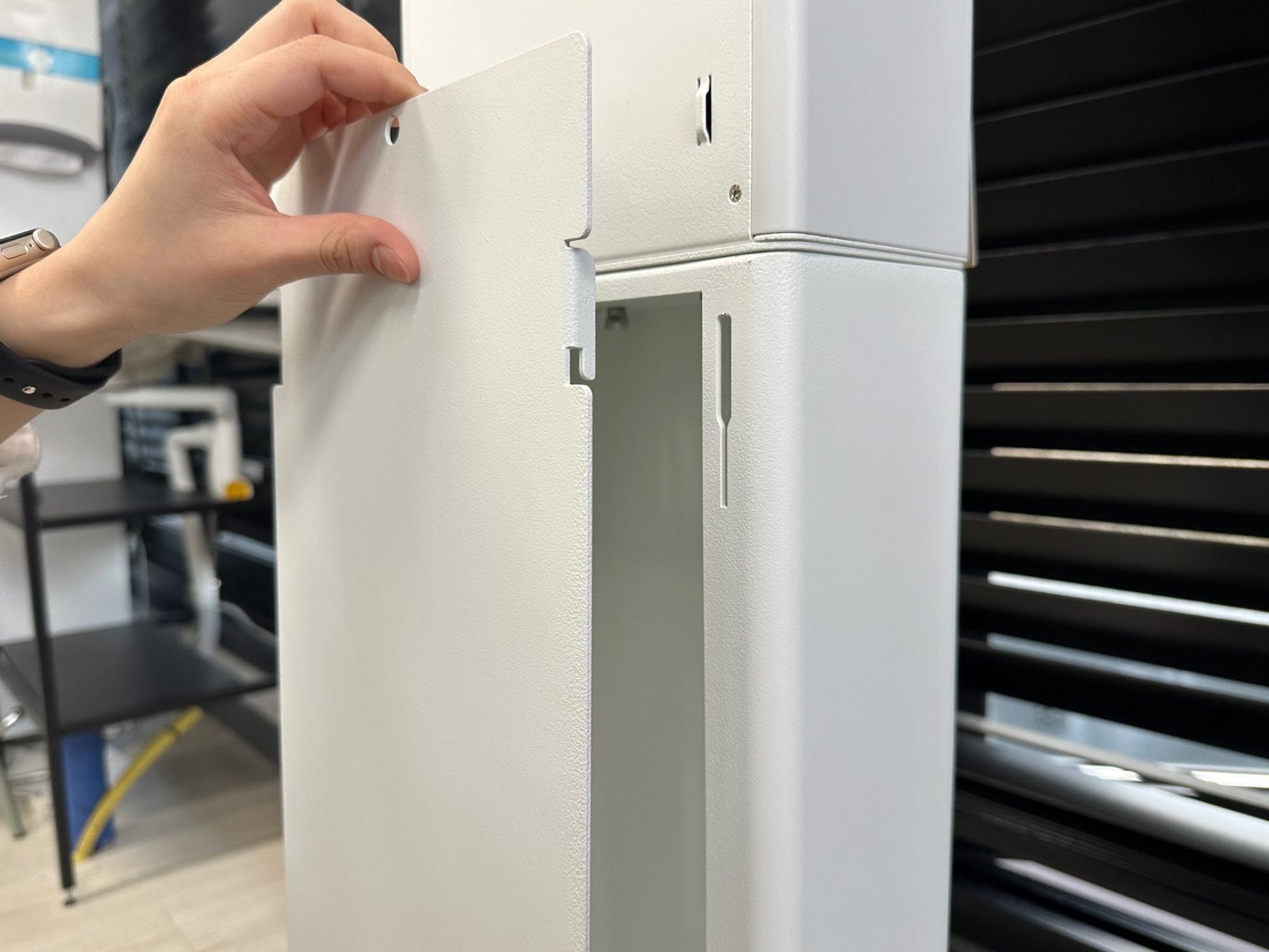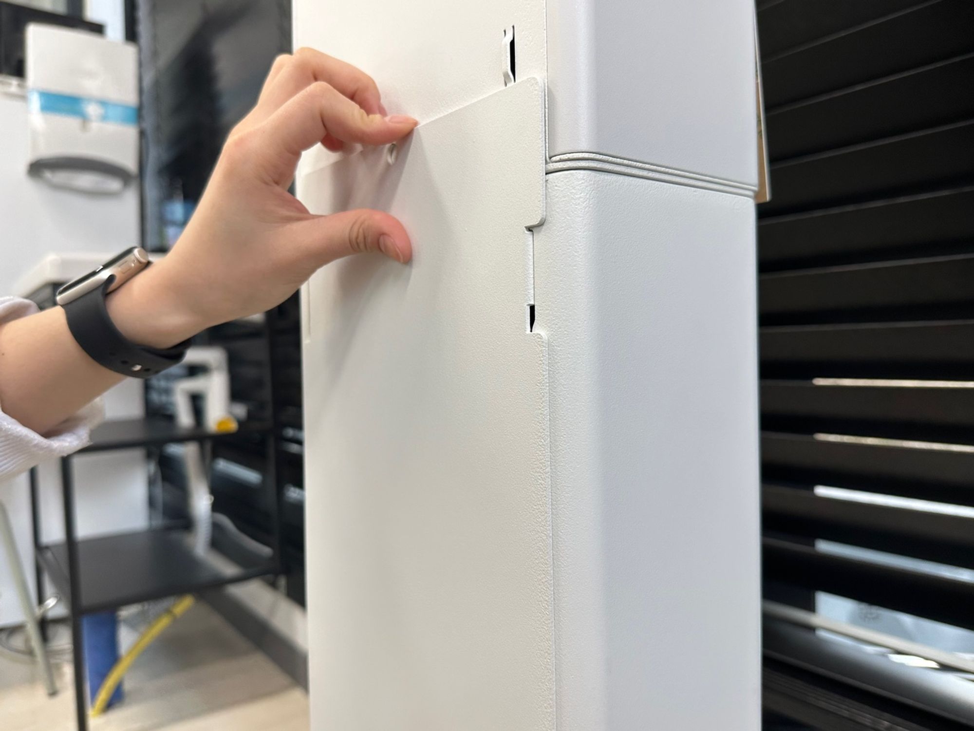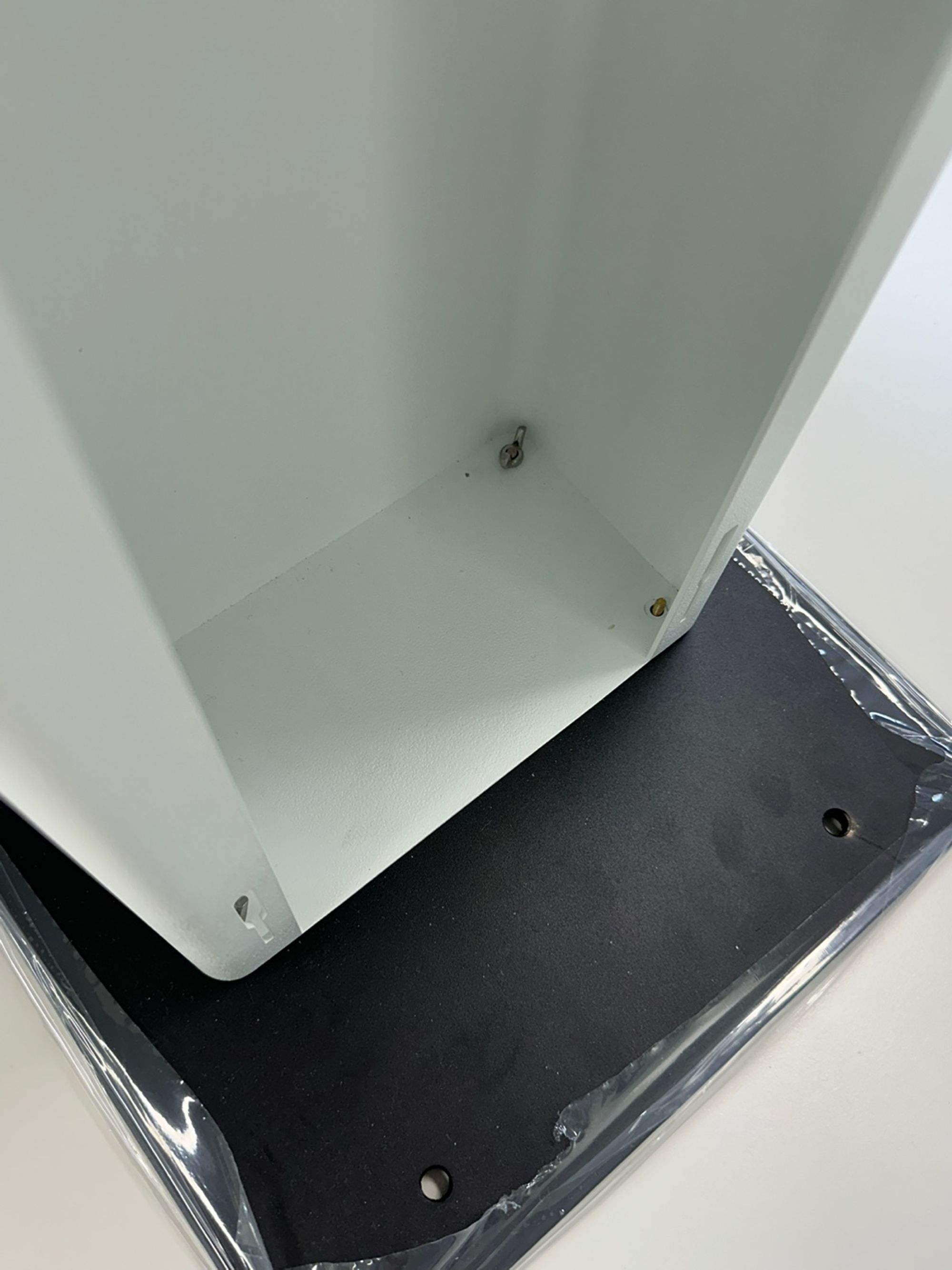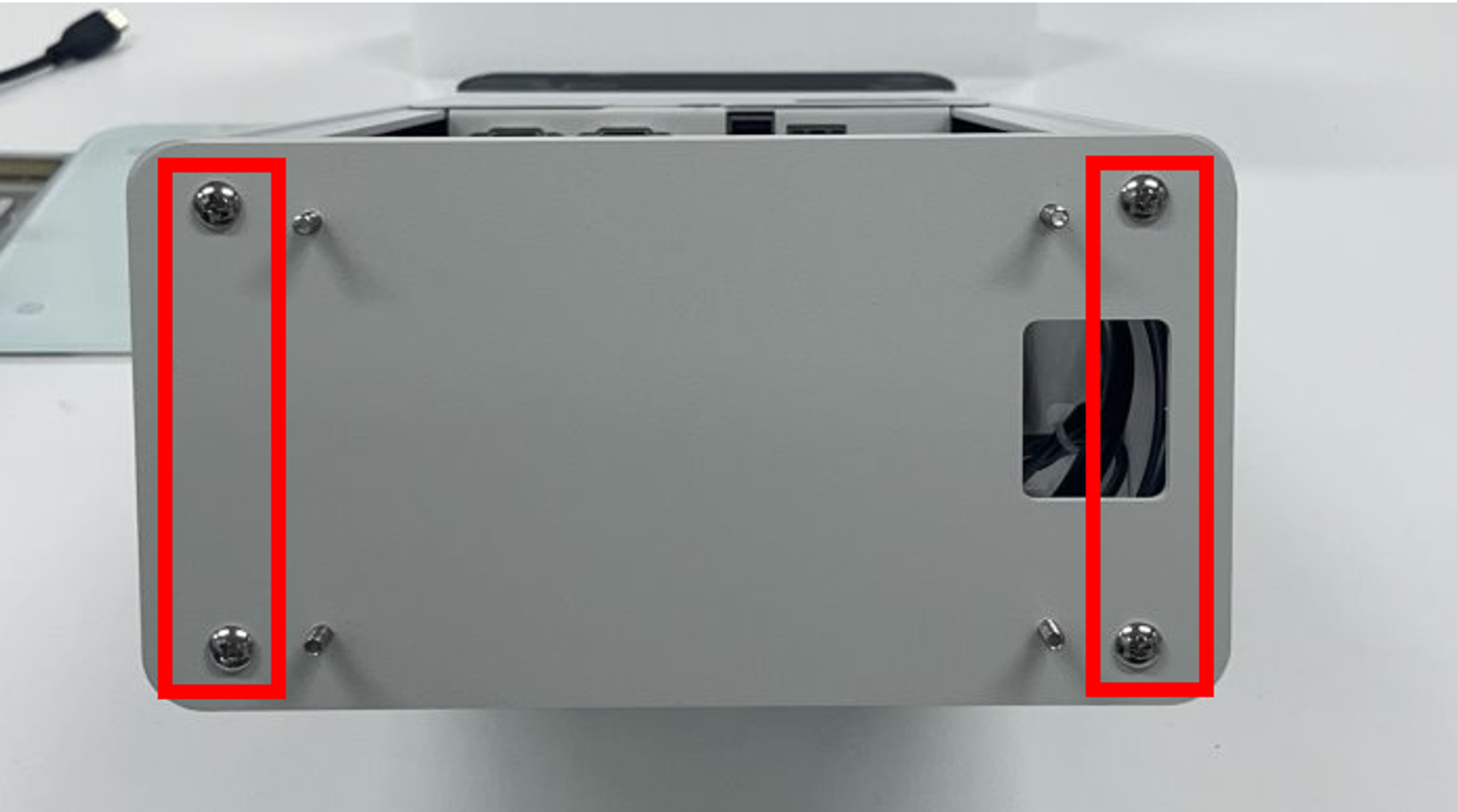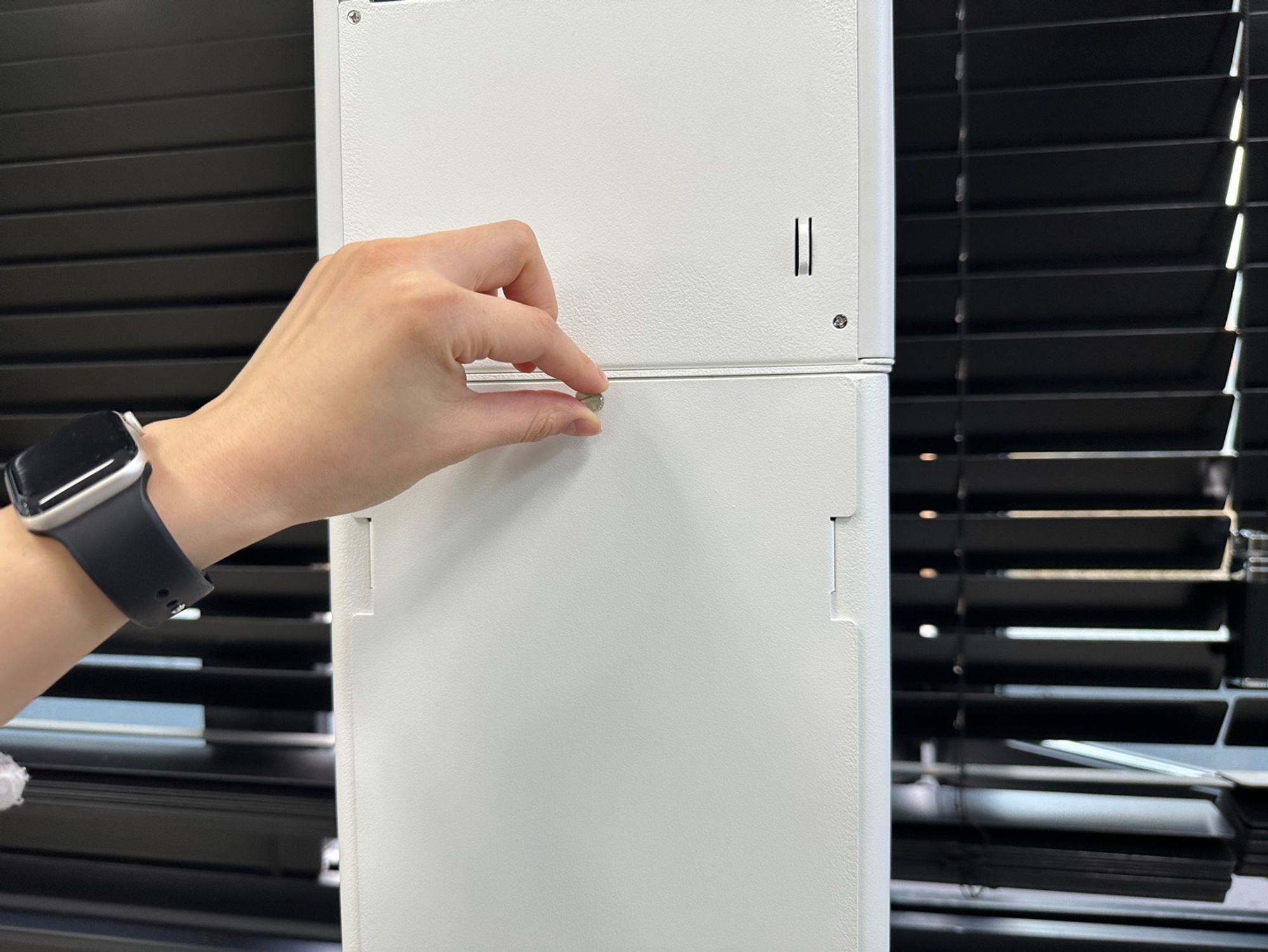 다음으로는 스탠드에 조립되어 있는 8번의 키오스크 안쪽 부분에 이미지의 빨간색 부분과 같이 조여진 나비 나사를 풀어주세요.
