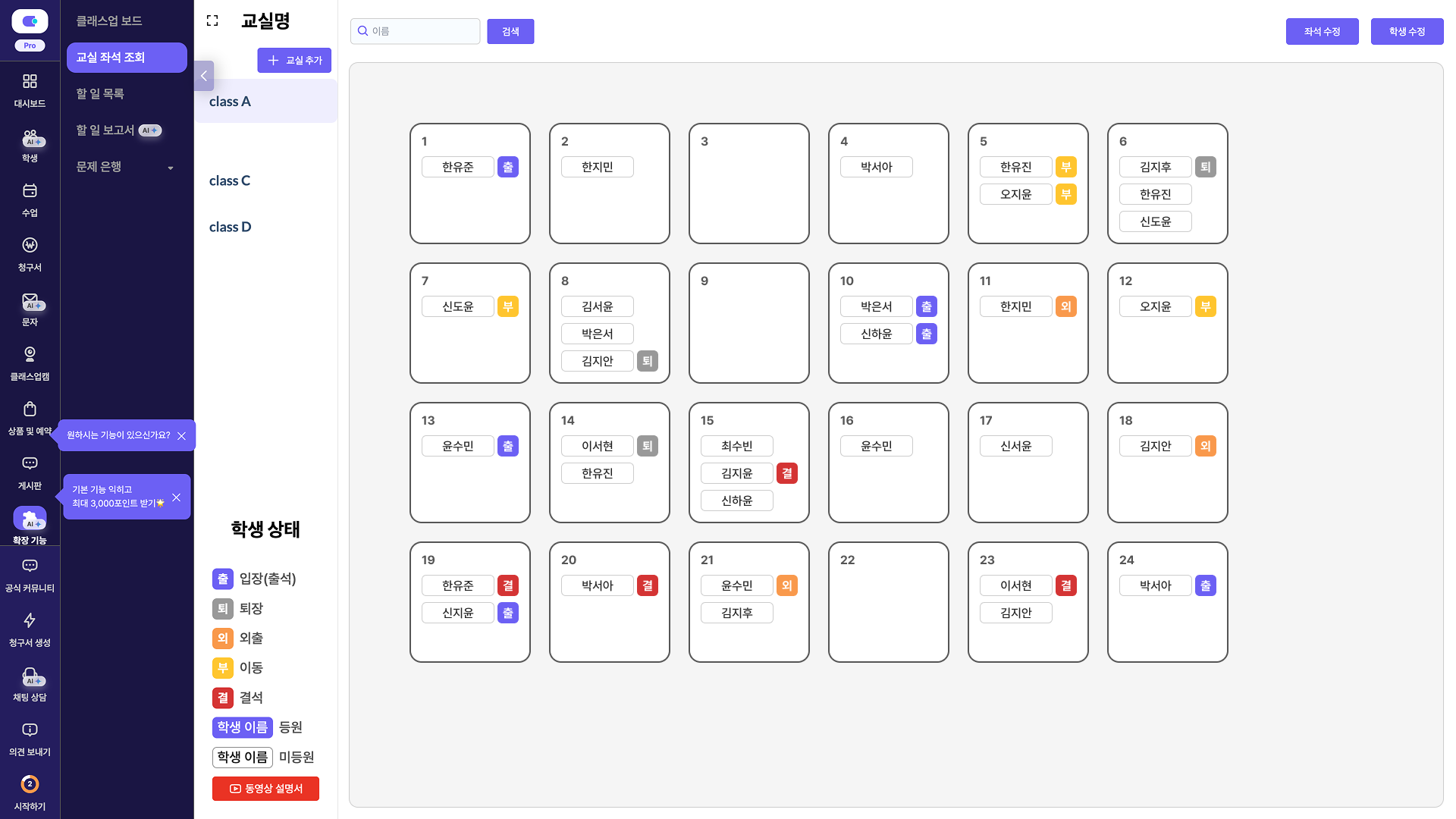 Pro 플랜의 출결은 다릅니다. 단순 '등/하원'을 넘어, 학생이 학원 내 '어디에 있는지'까지 파악합니다.
