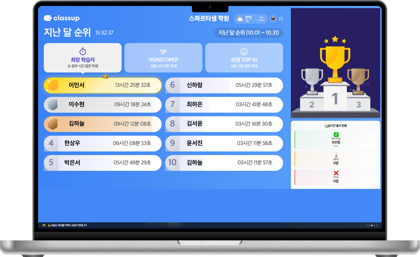 학생들의 순공 시간 랭킹, 출결 현황을 TV로 보여줘 학습 분위기를 잡고 싶을 때