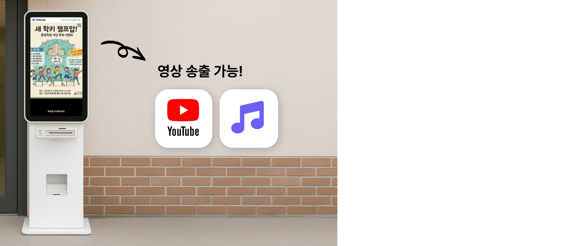 사진만 가능했던 Lite 플랜과 달리, Pro 플랜은 키오스크 대기 화면에 생동감 있는 '영상' 광고(유튜브/MP4)를 송출하여 홍보 효과를 극대화할 수 있습니다.