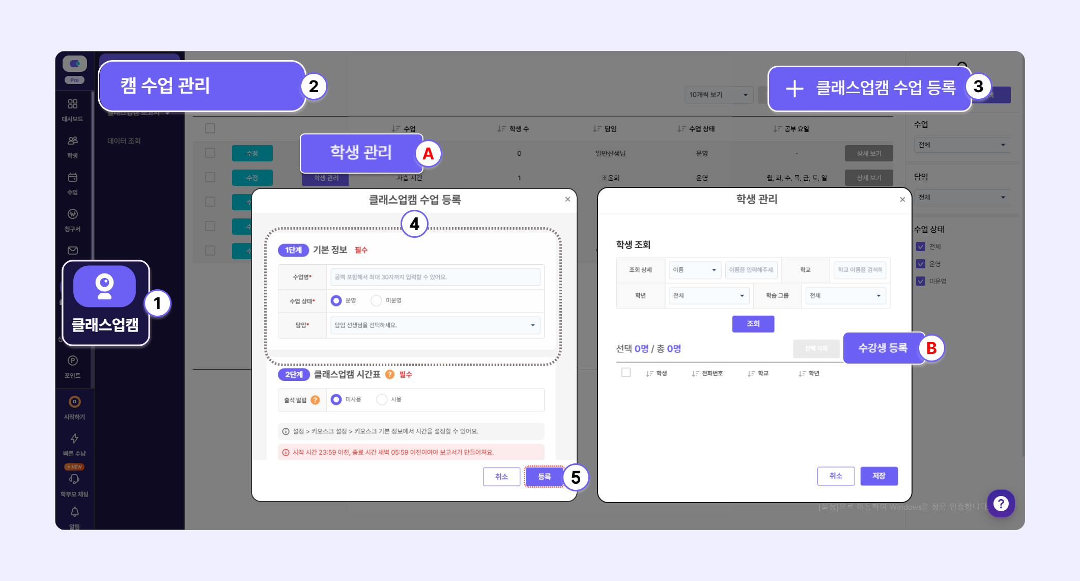 [클래스업캠] > [캠 수업 관리]클래스업 캠 수업 등록 절차: 1번 - 5번, 클래스업캠 수업에 학생 추가 절차: A - B