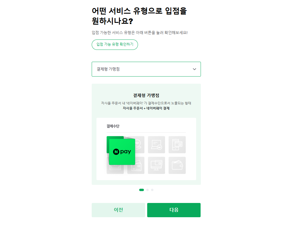 네이버페이센터로 접속하여 결제형 가맹점으로 선택한 후 신청 정보를 입력해 주세요.