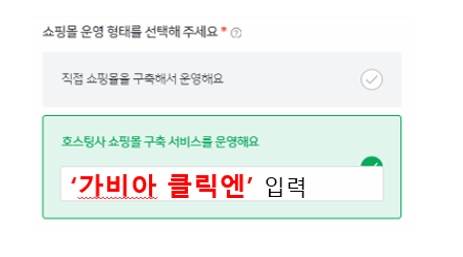 호스팅사 쇼핑몰 구축 서비스 이용을 선택한 후 [가비아 클릭엔]을 입력해 주세요.