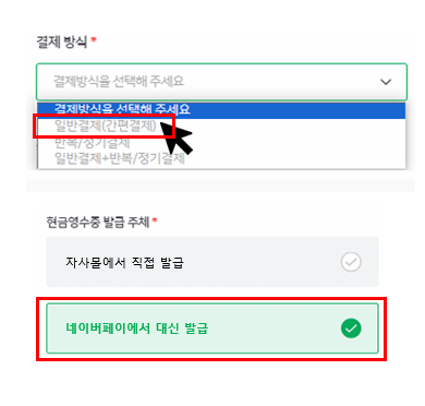 일반결제 (간편결제) + 네이버페이에서 대신 발급을 선택해 주세요.