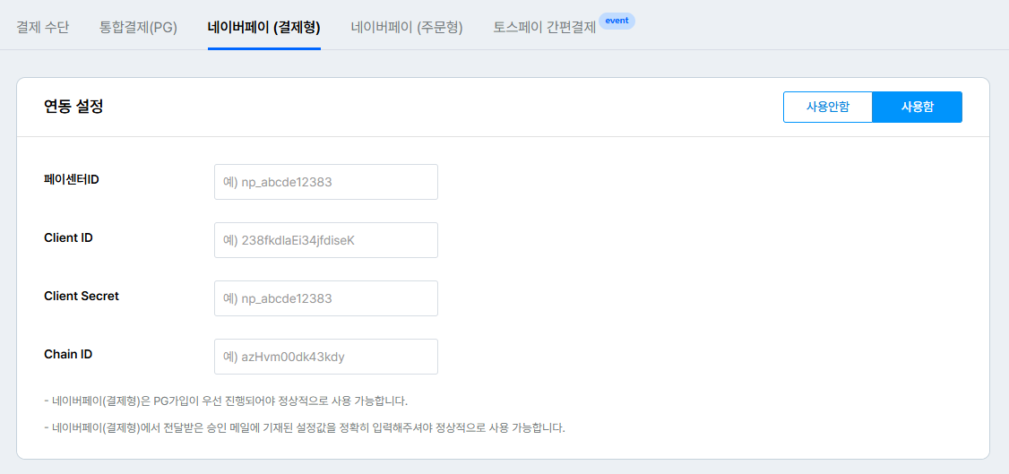 • 관리자 페이지 > 설정 > 결제 설정 > 네이버페이 [결제형]