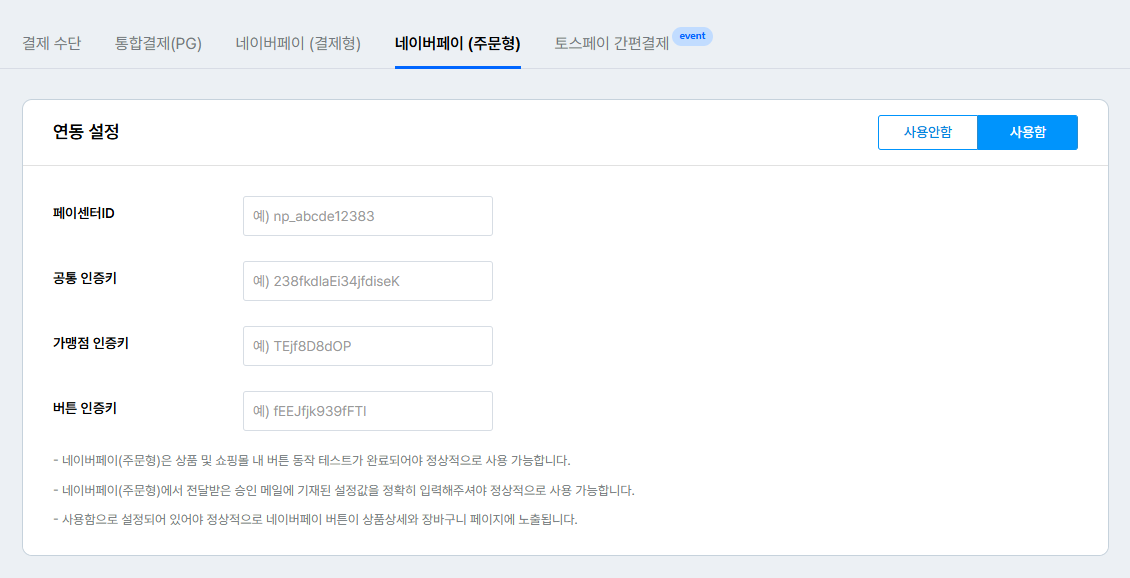 관리자 페이지 > 설정 > 결제 설정 > 네이버페이 [주문형]