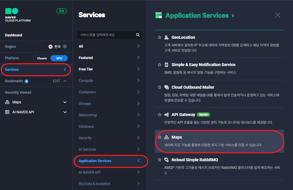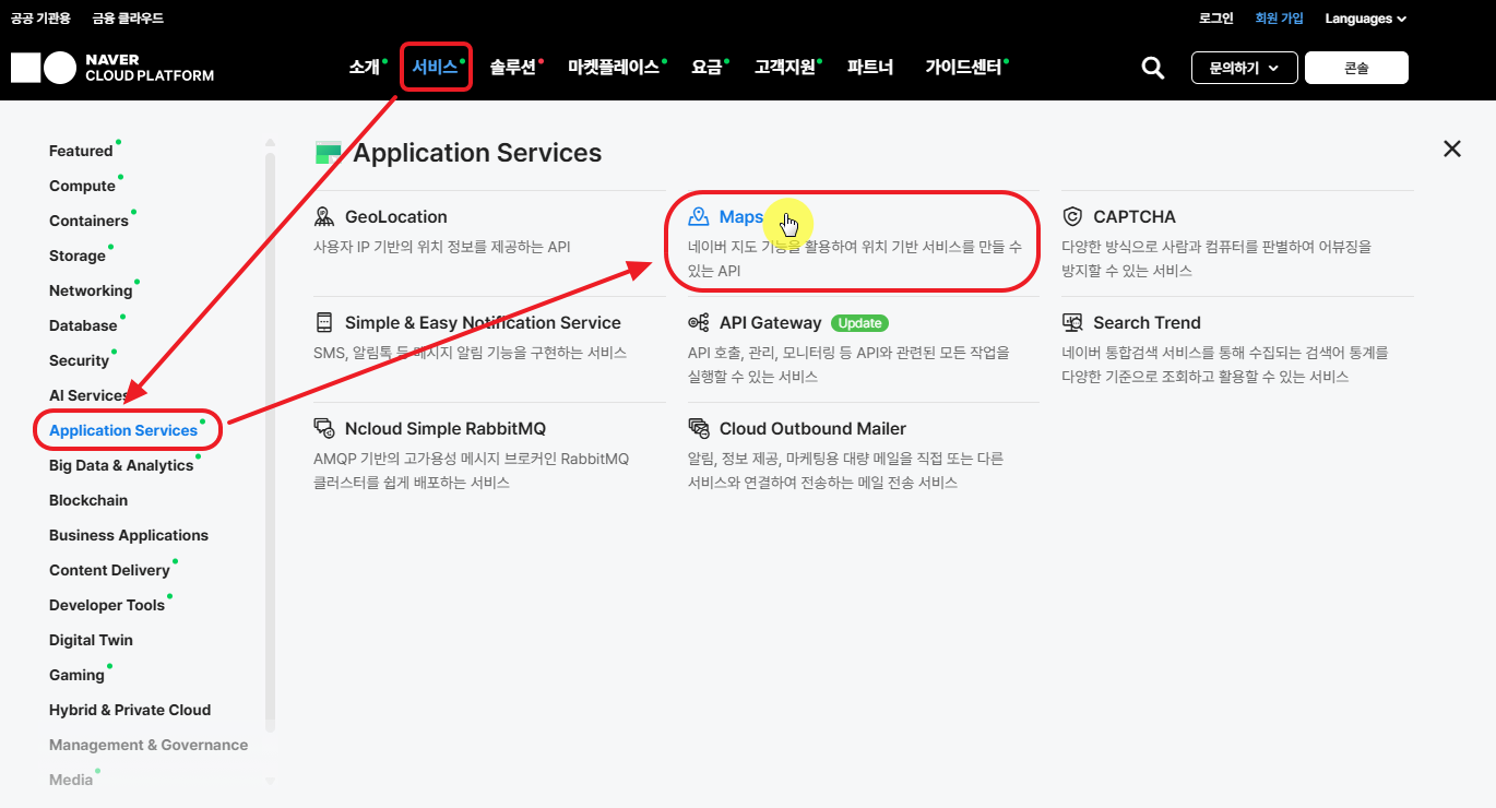 • 서비스 > Application Services > Maps 를 선택합니다.