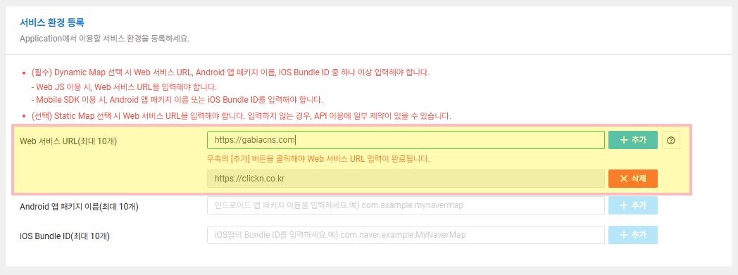 Web 서비스 URL은 https:// 를 포함해 등록해 주세요.