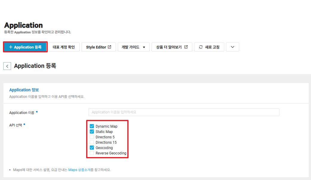 • Application 등록 버튼을 클릭한 후 애플리케이션의 이름과 사용할 API를 다음과 같이 선택해 주세요.