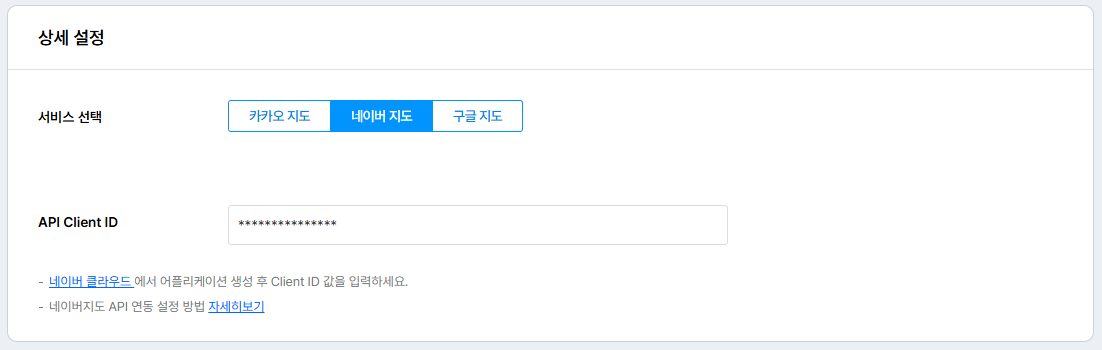 • 관리자 페이지 > 사이트 관리 > 지도 메뉴에 Client ID 를 입력해 주세요.