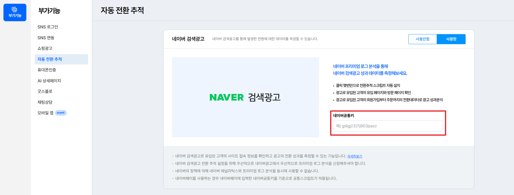 • 관리자 페이지 > 부가기능 > 자동 전환 추적 > 네이버 검색광고