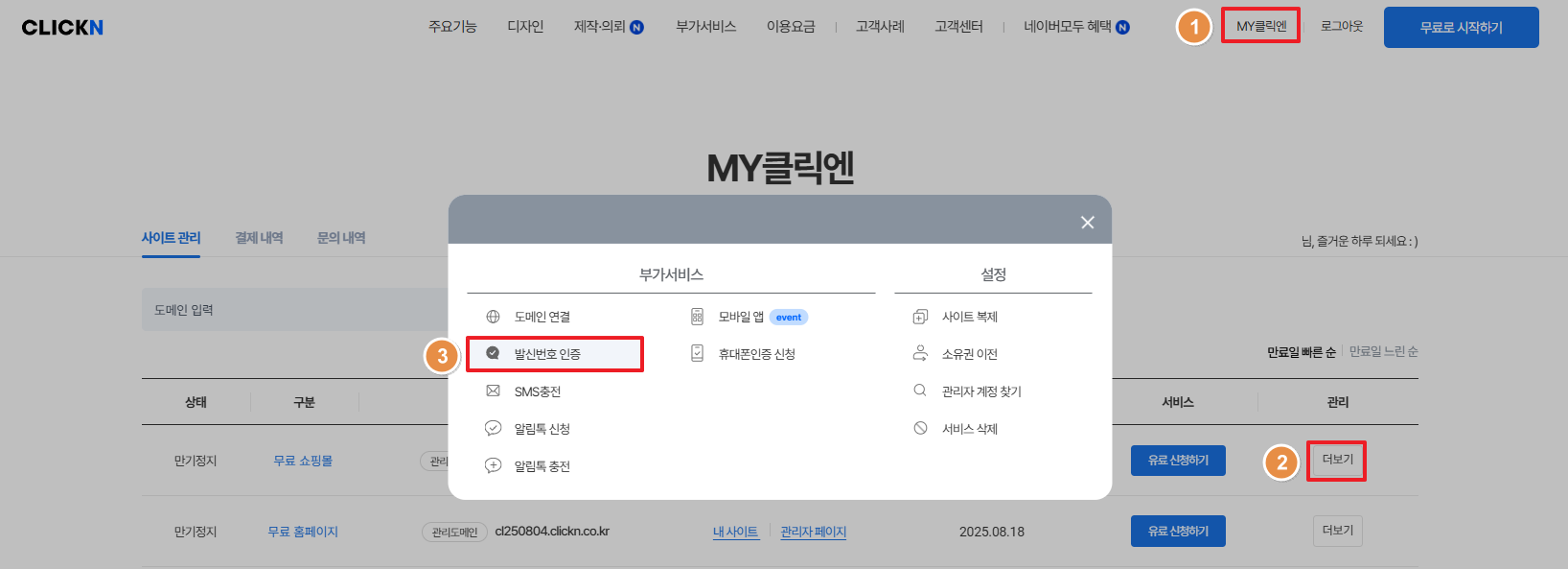 SMS , 알림톡전송 기능을 사용하시기 위해 클릭엔 홈페이지 > MY클릭엔 > 더보기 > 발신번호 인증을 진행해 주세요.