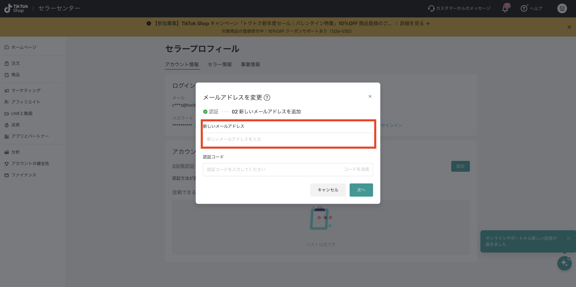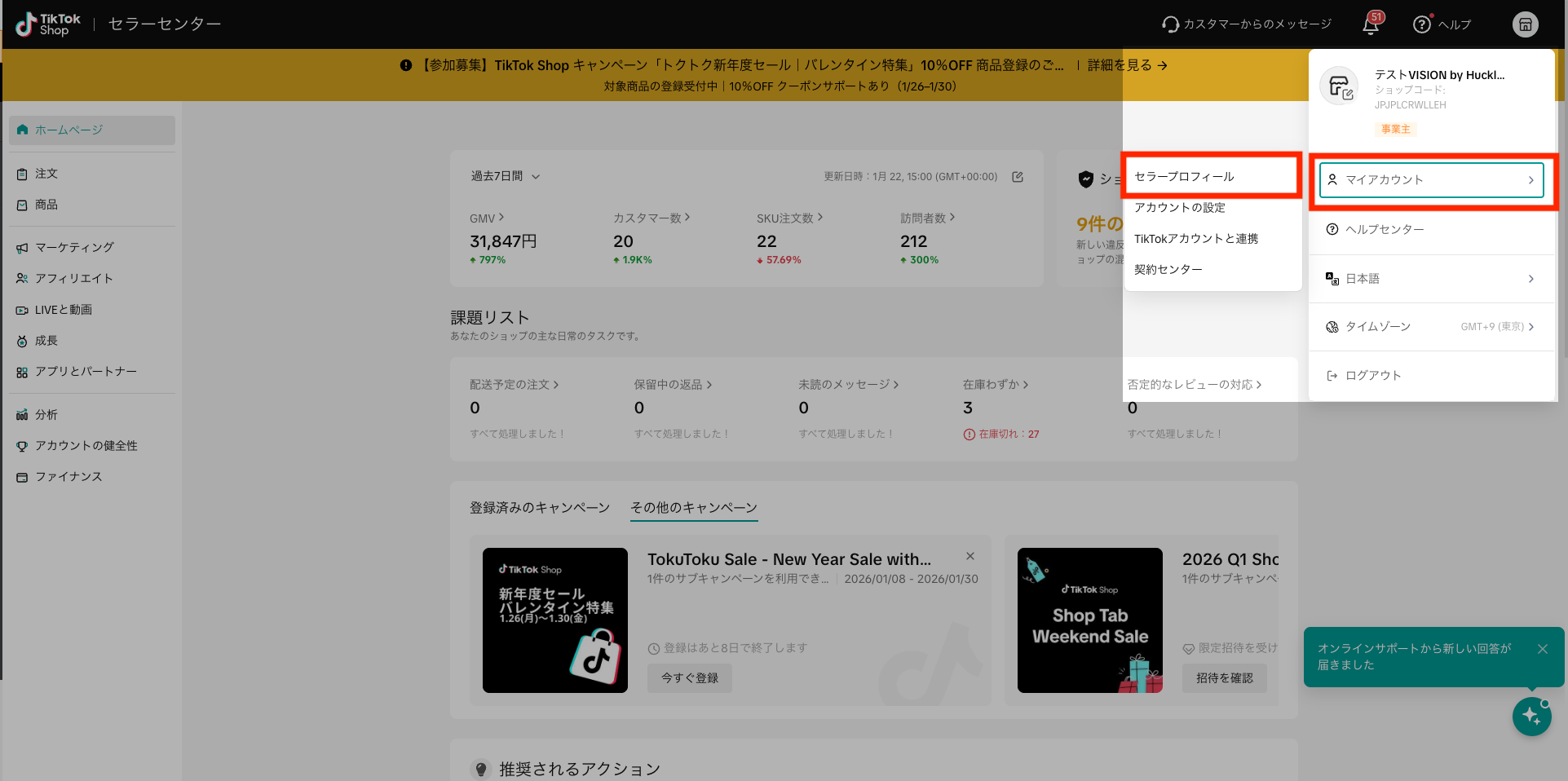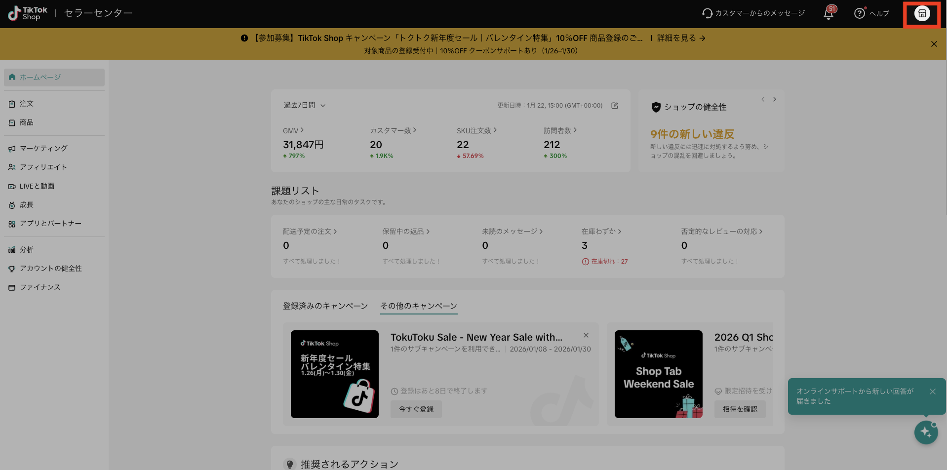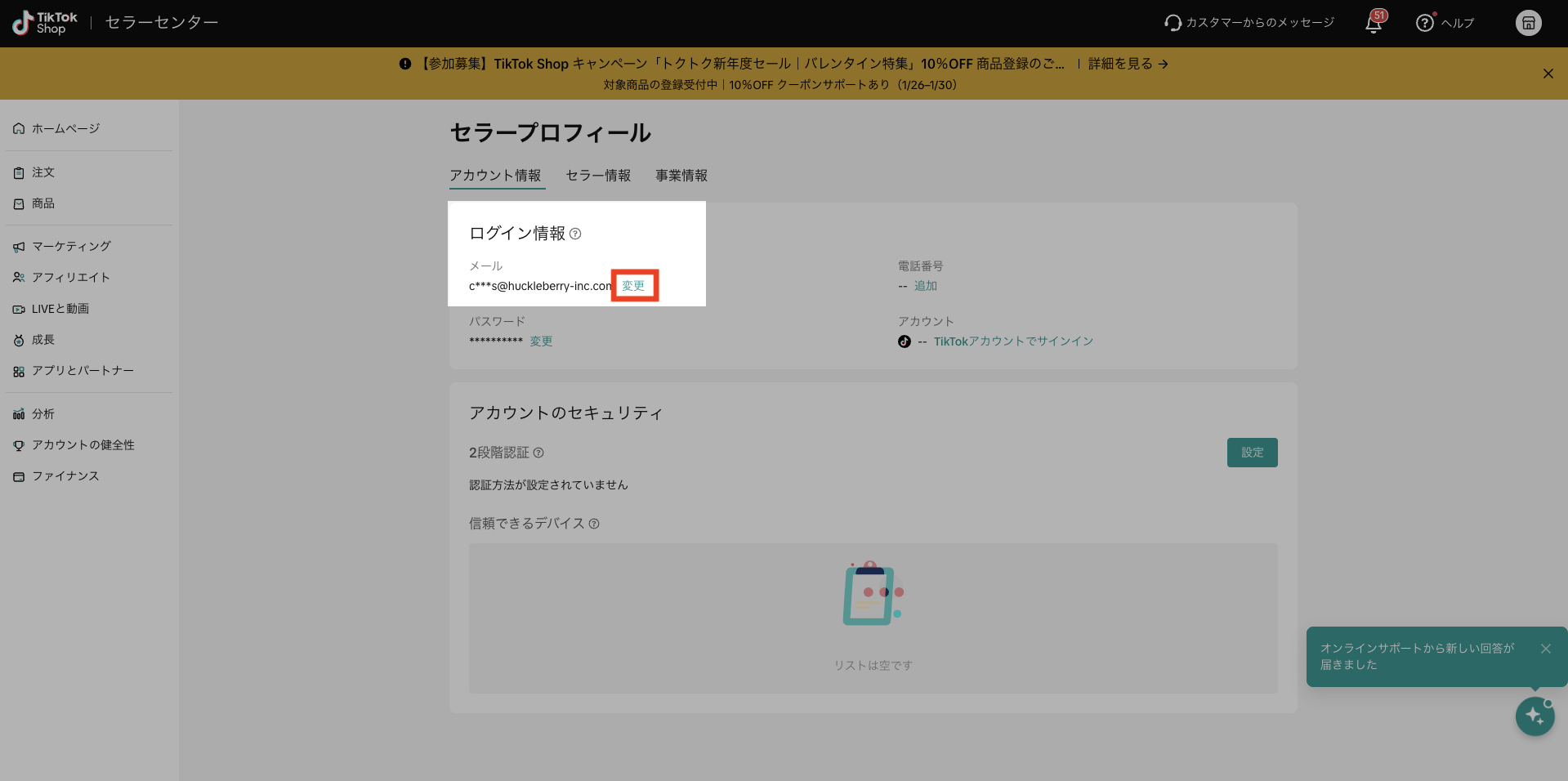 TikTok Shop セラーセンター に「オーナーアカウント」でログイン
