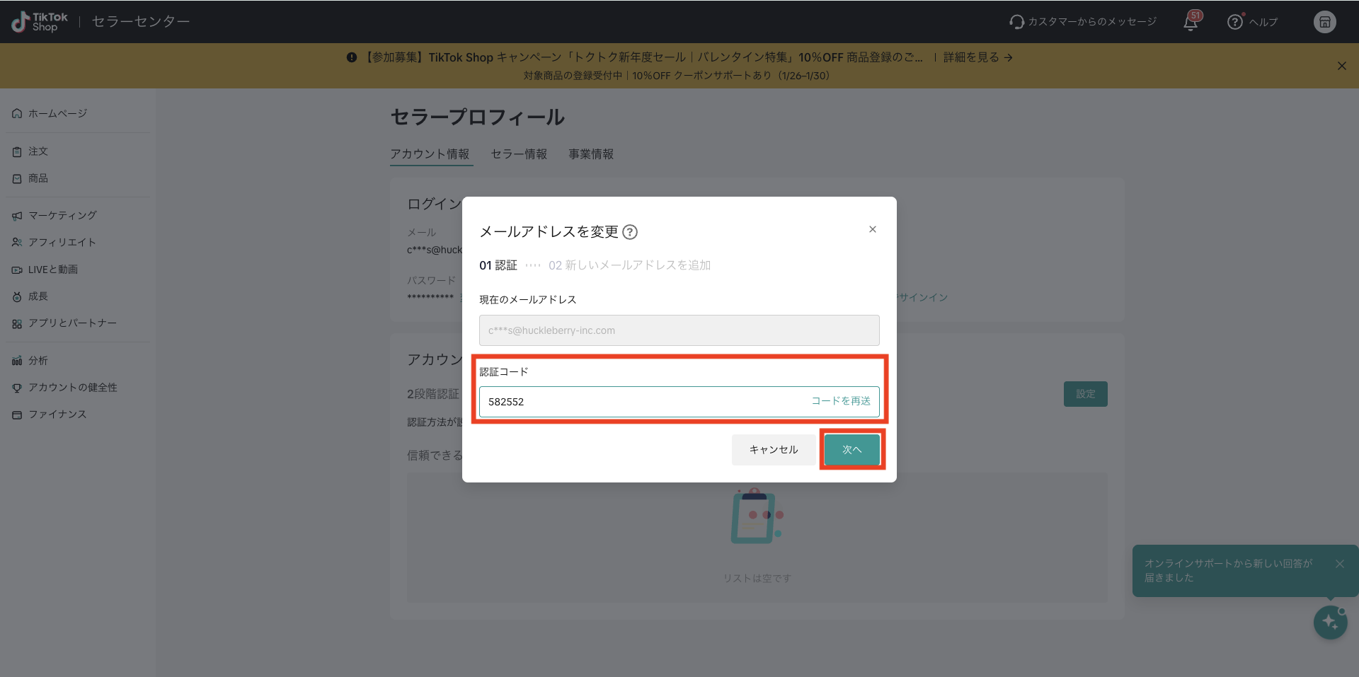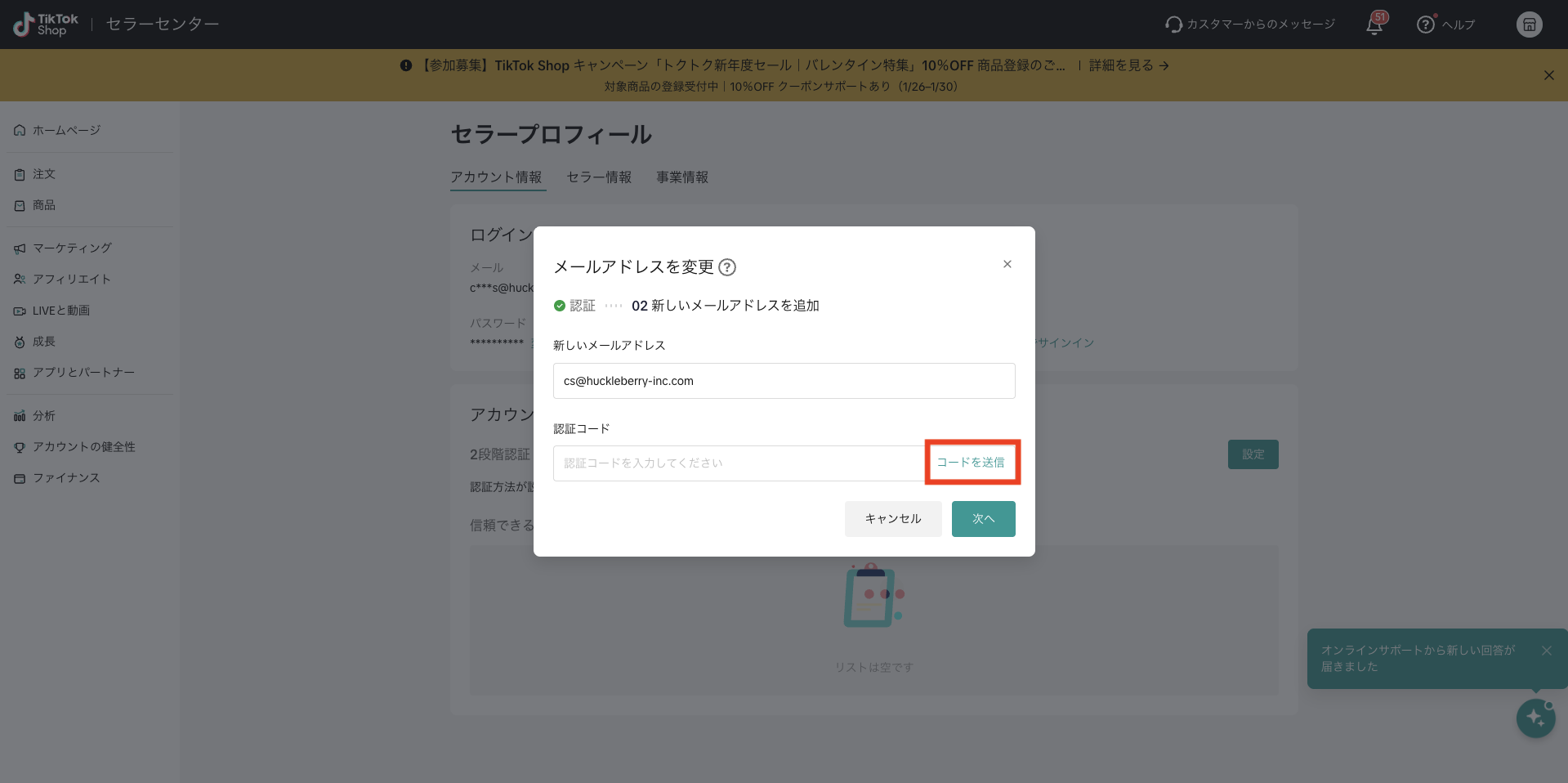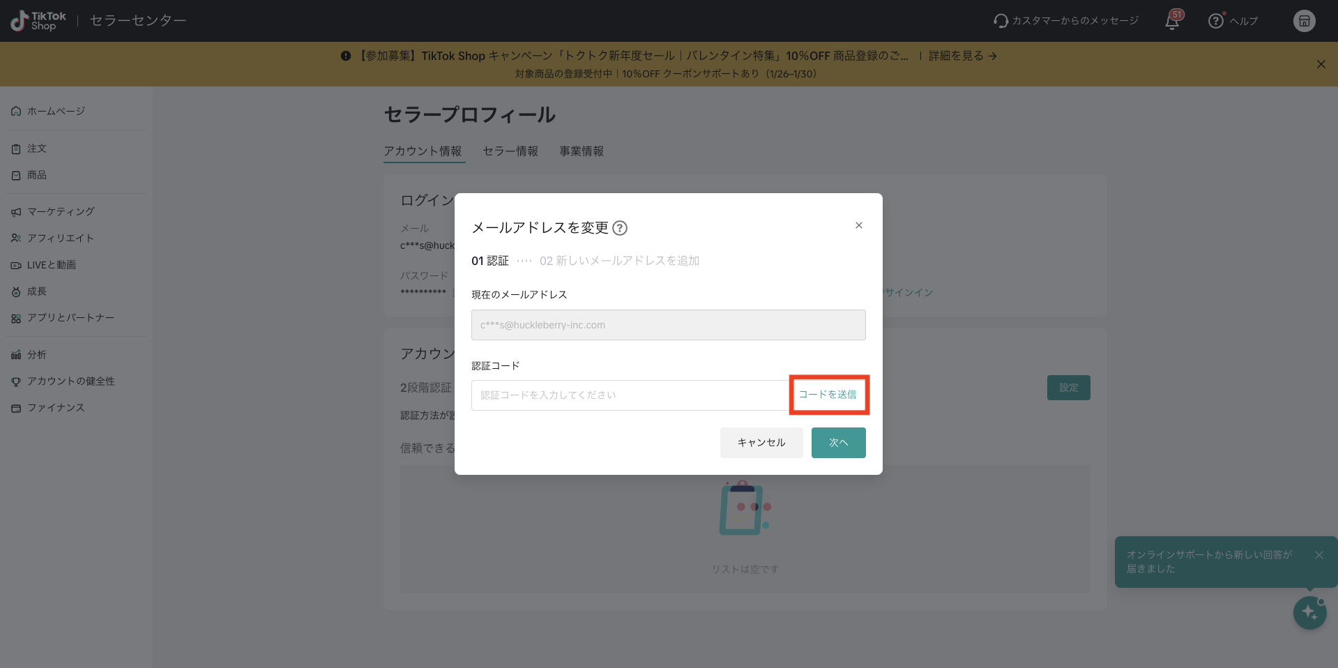 現在登録されているメールアドレス宛に認証コードが送信されます