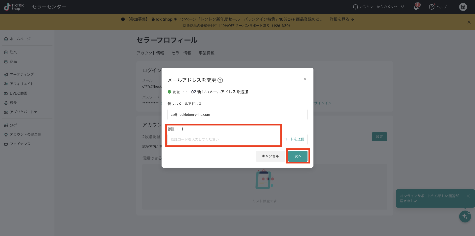 アプリ管理画面へのアクセスするには、TikTok Shopのオーナーアカウントに紐づいているメールアドレスでログインする必要があります