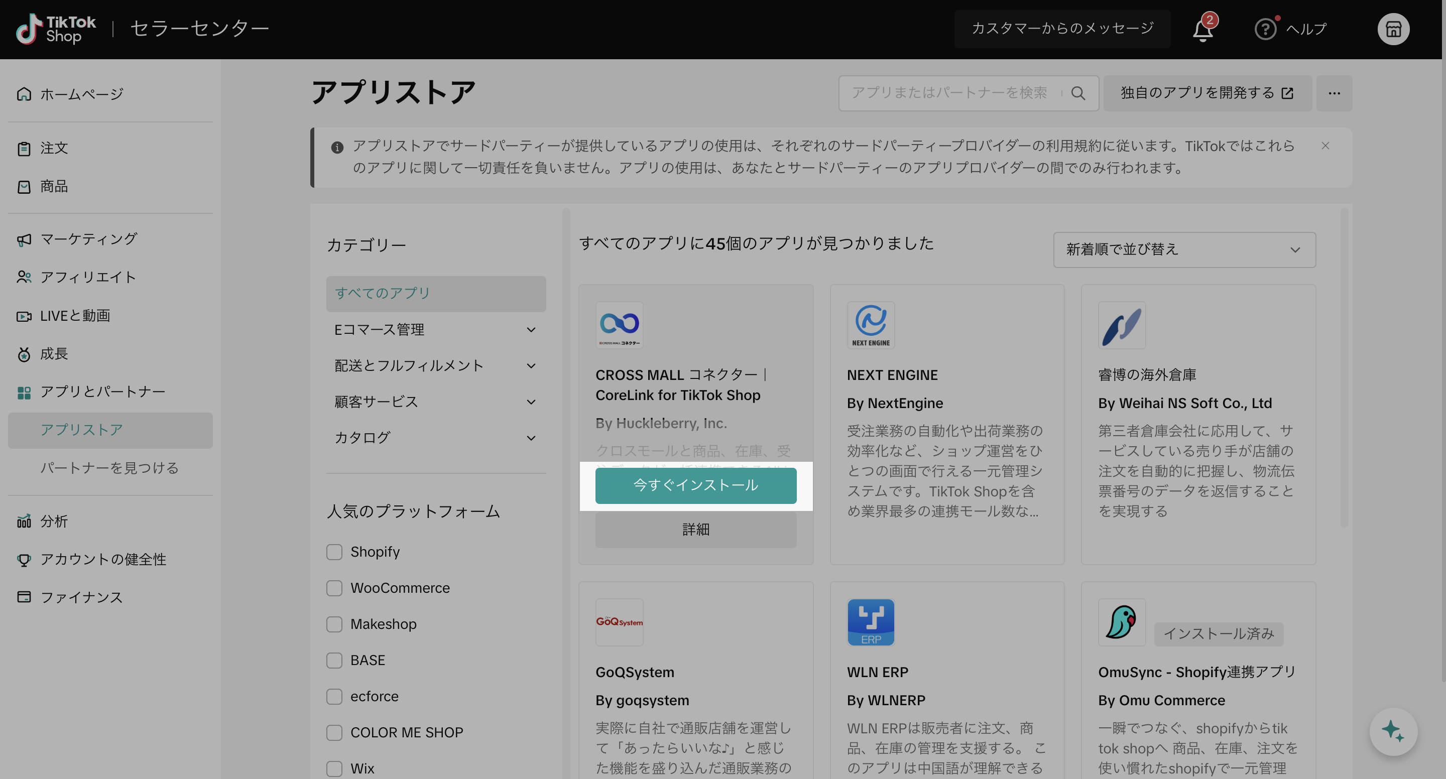 TikTok Shop セラーセンター「アプリストア」にて、