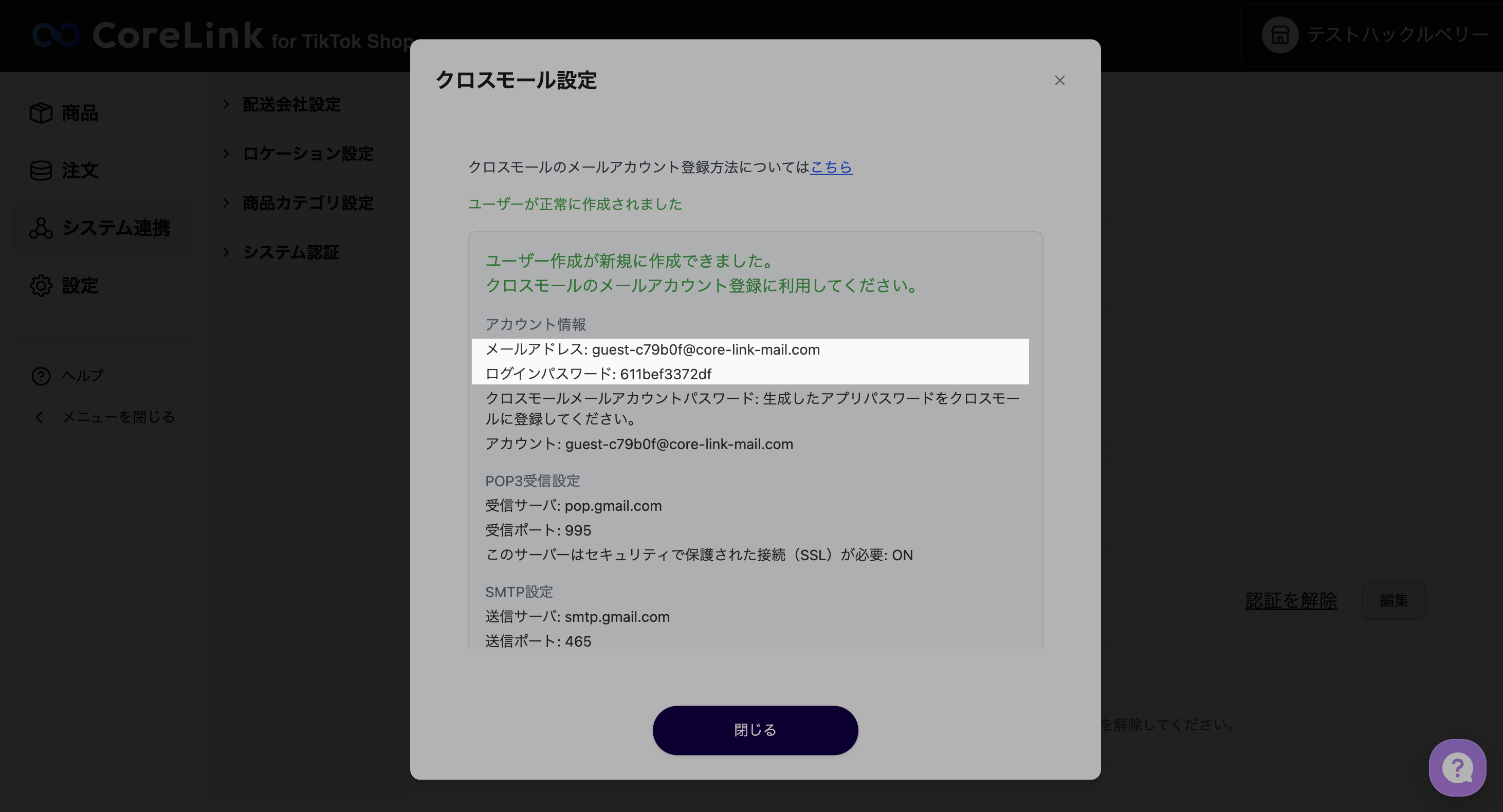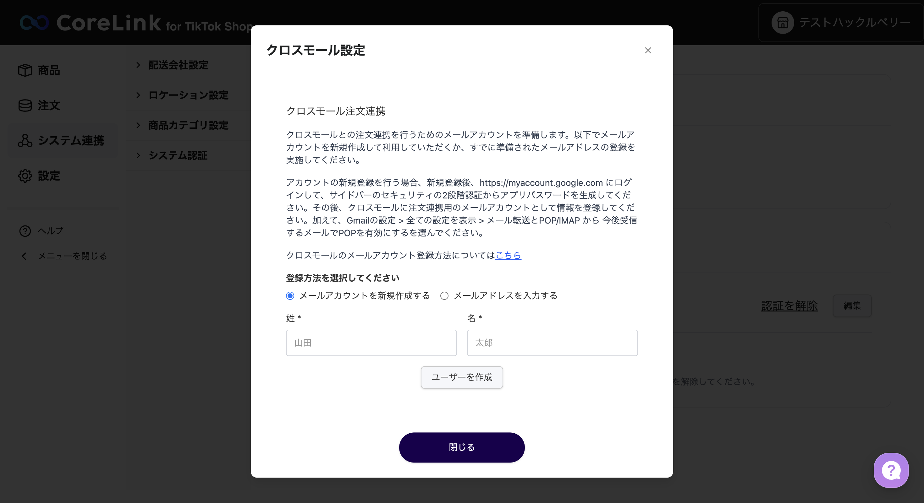 1. クロスモール注文連携にて、新規にメールアカウントを作成していただくか、すでに準備済みのメールアドレスを登録してください。