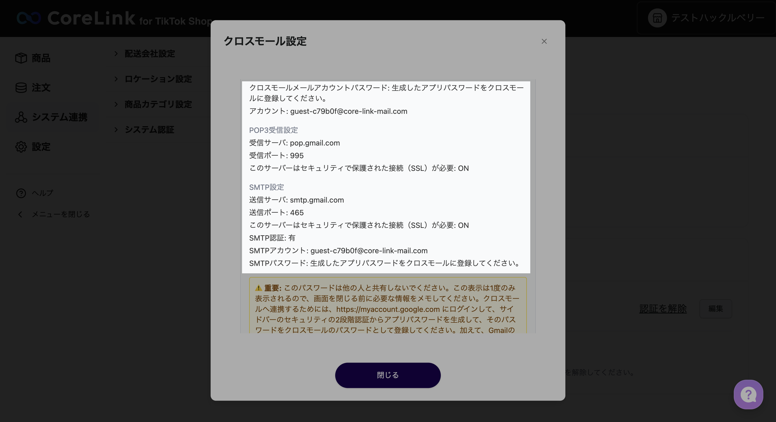 以下に表示されている情報は、「ステップ4. 注文受信用メールアカウントの登録」で必要です。一度しか表示されませんのでご注意ください。