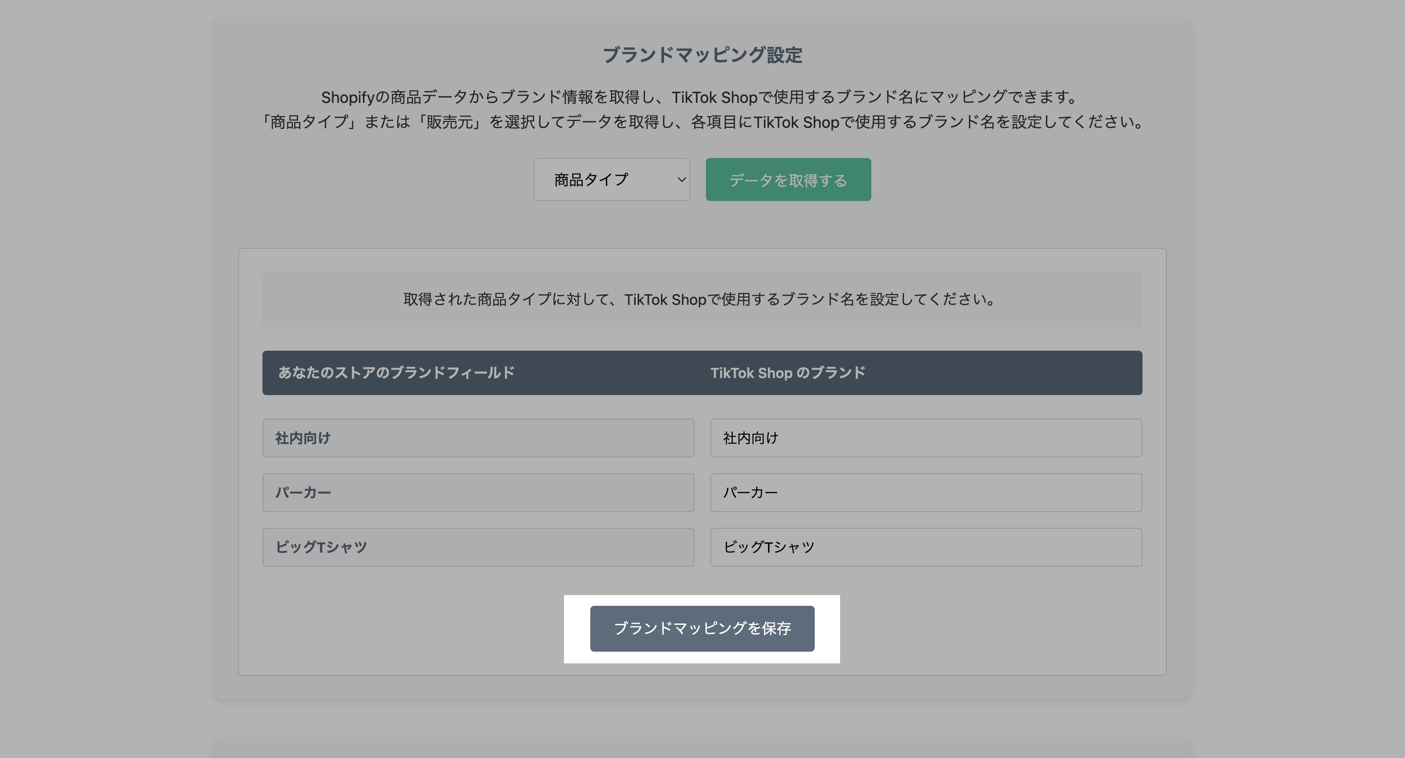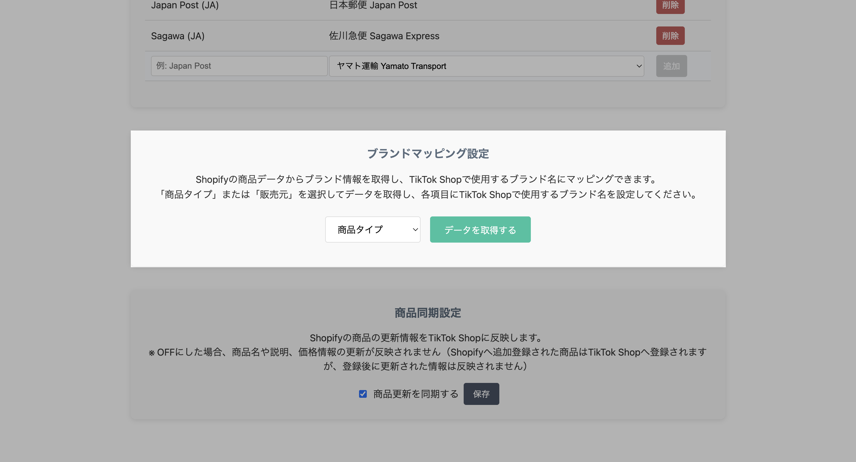 Shopifyの商品データからブランド情報を取得し、TikTok Shop上で使用するブランド名に設定することができる機能です。