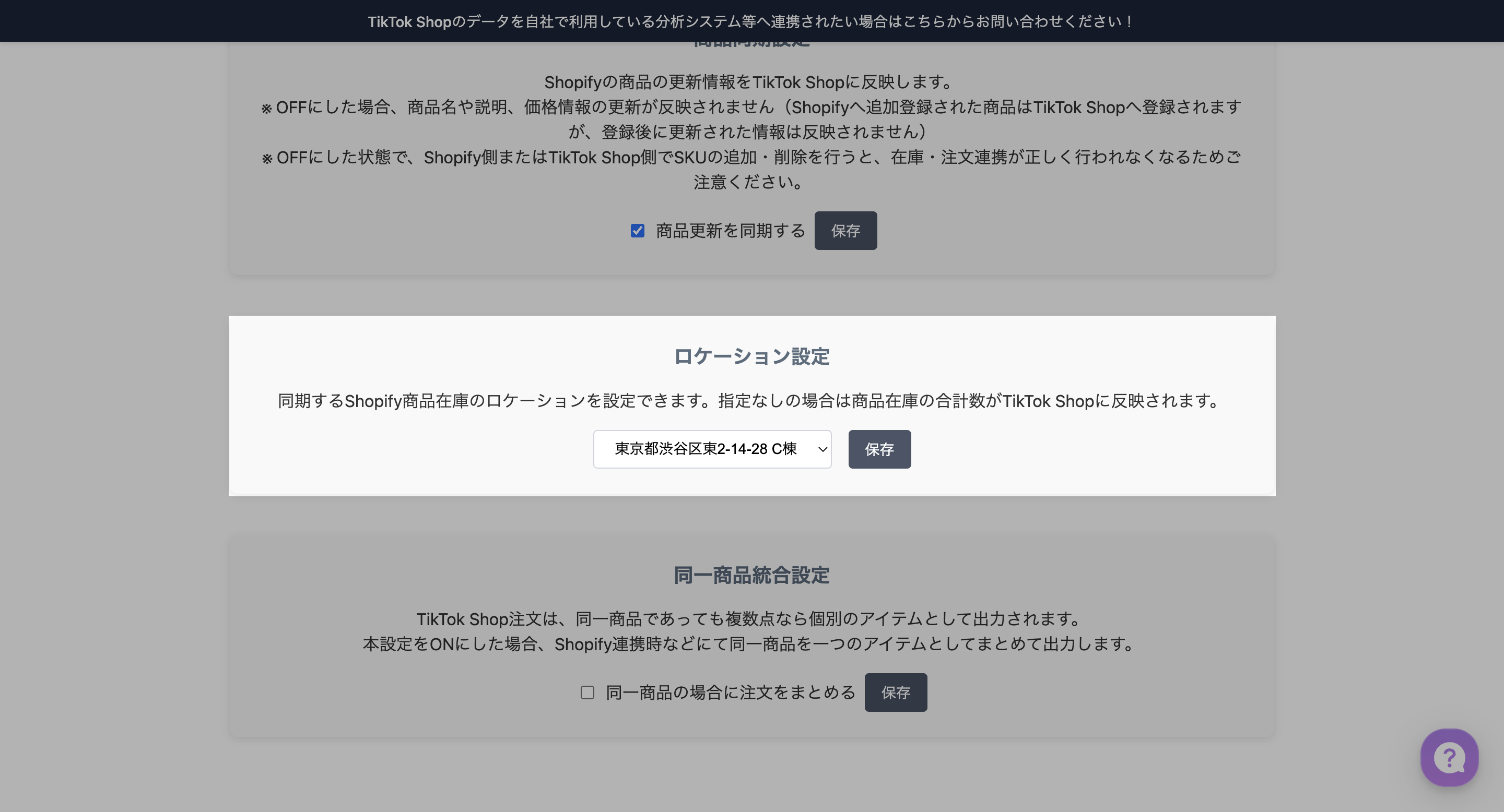 指定なしの場合は、Shopifyに登録されている全ロケーションの在庫数の合計がTikTok Shopへ反映されます。