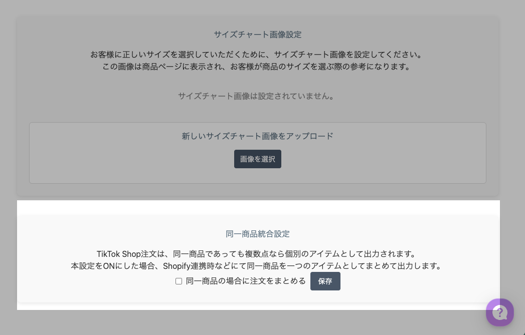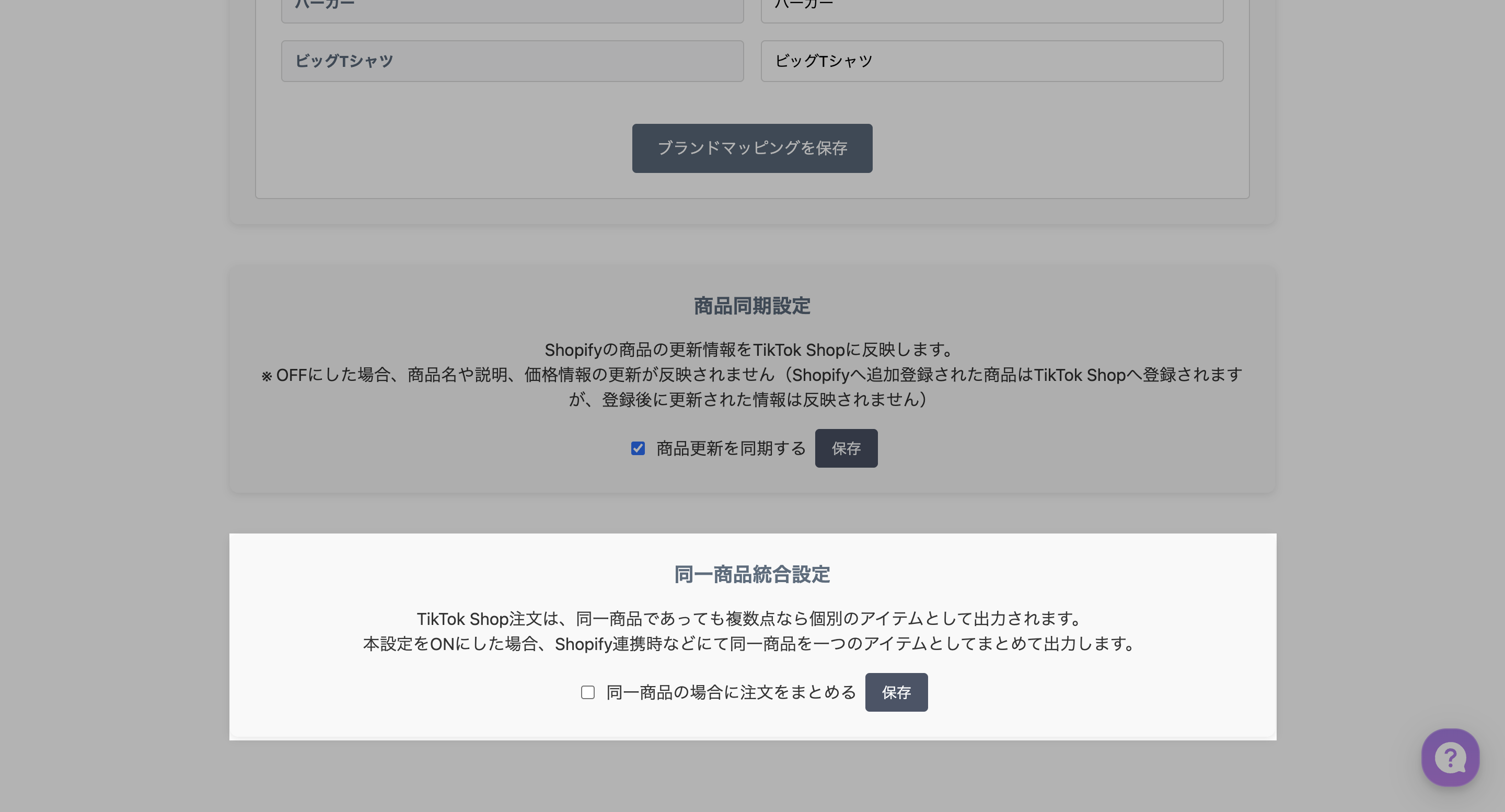 同一商品統合設定にて、「同一商品の場合に注文をまとめる」にチェックを入れ、保存をクリック