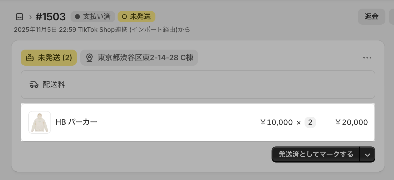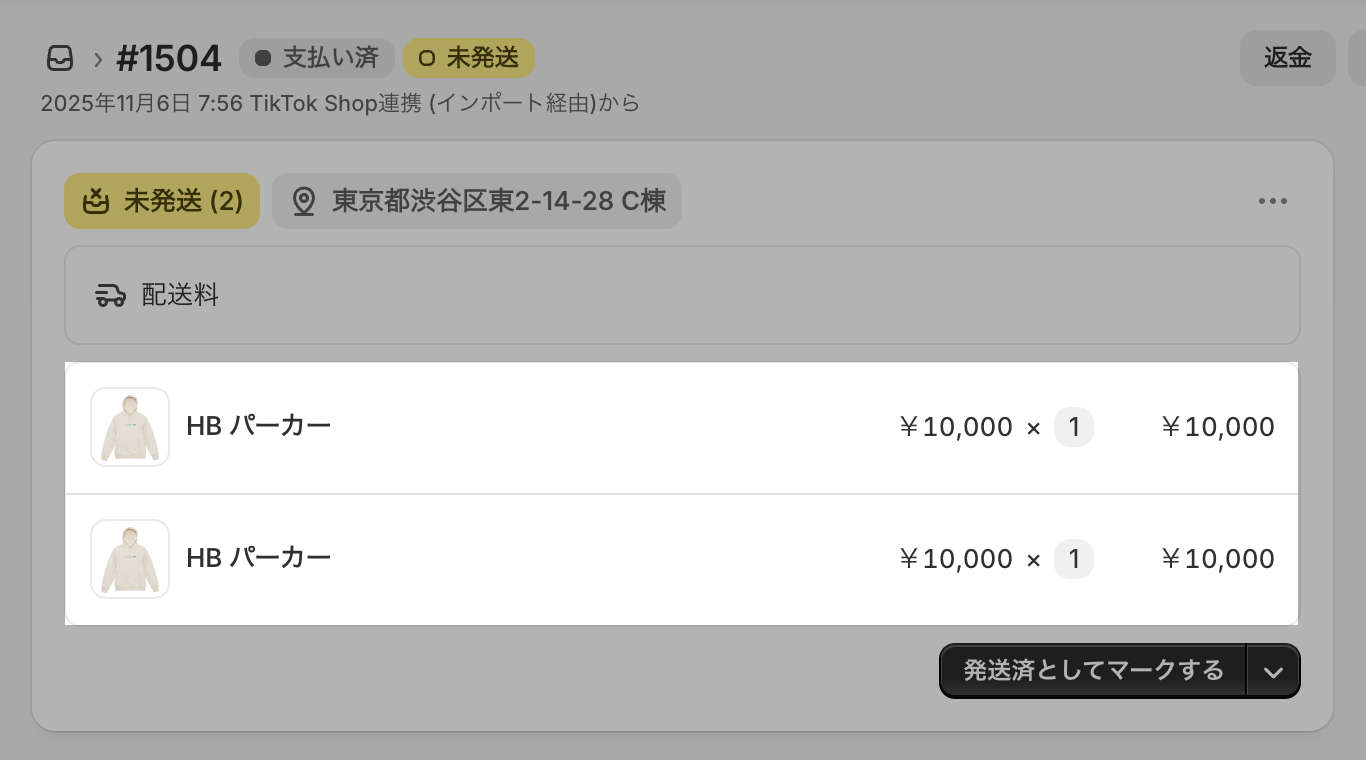 同一商品が複数購入された場合に、各商品が1つのアイテムにまとめて出力されます。