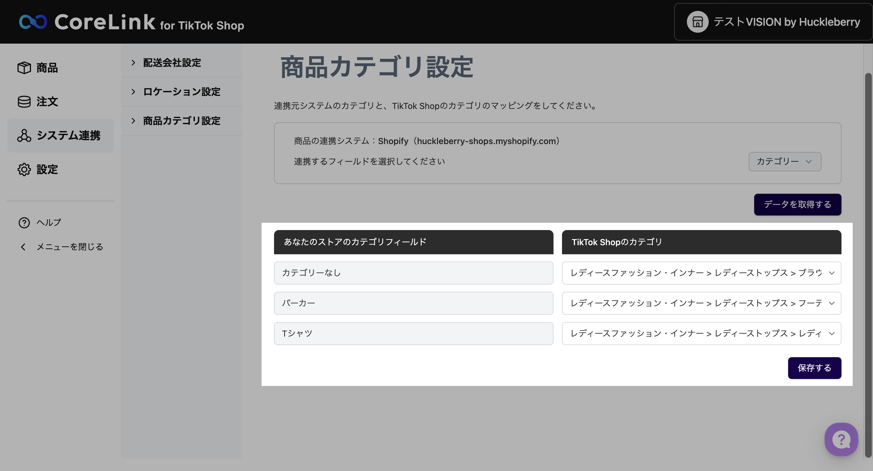 取得されたカテゴリごとに紐付ける「TikTok Shopのカテゴリ」を選択し、保存するをクリック