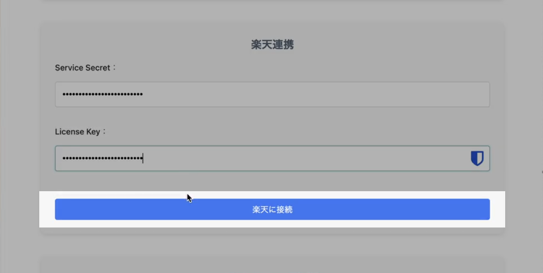 1. 楽天連携設定にて「Service Secret」「License Key」を入力し、
