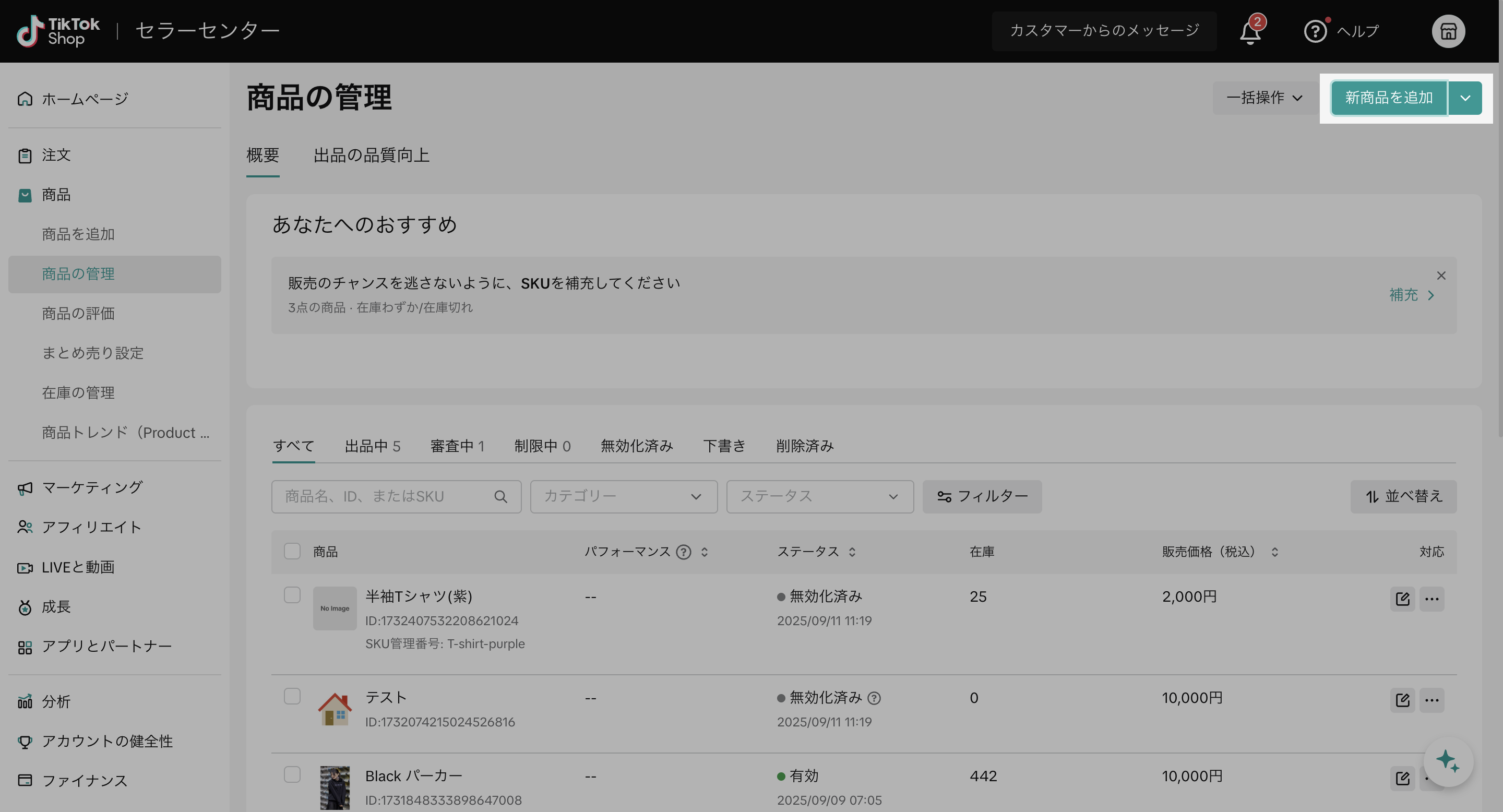 手動でTikTok Shopセラーセンター上に商品を追加する