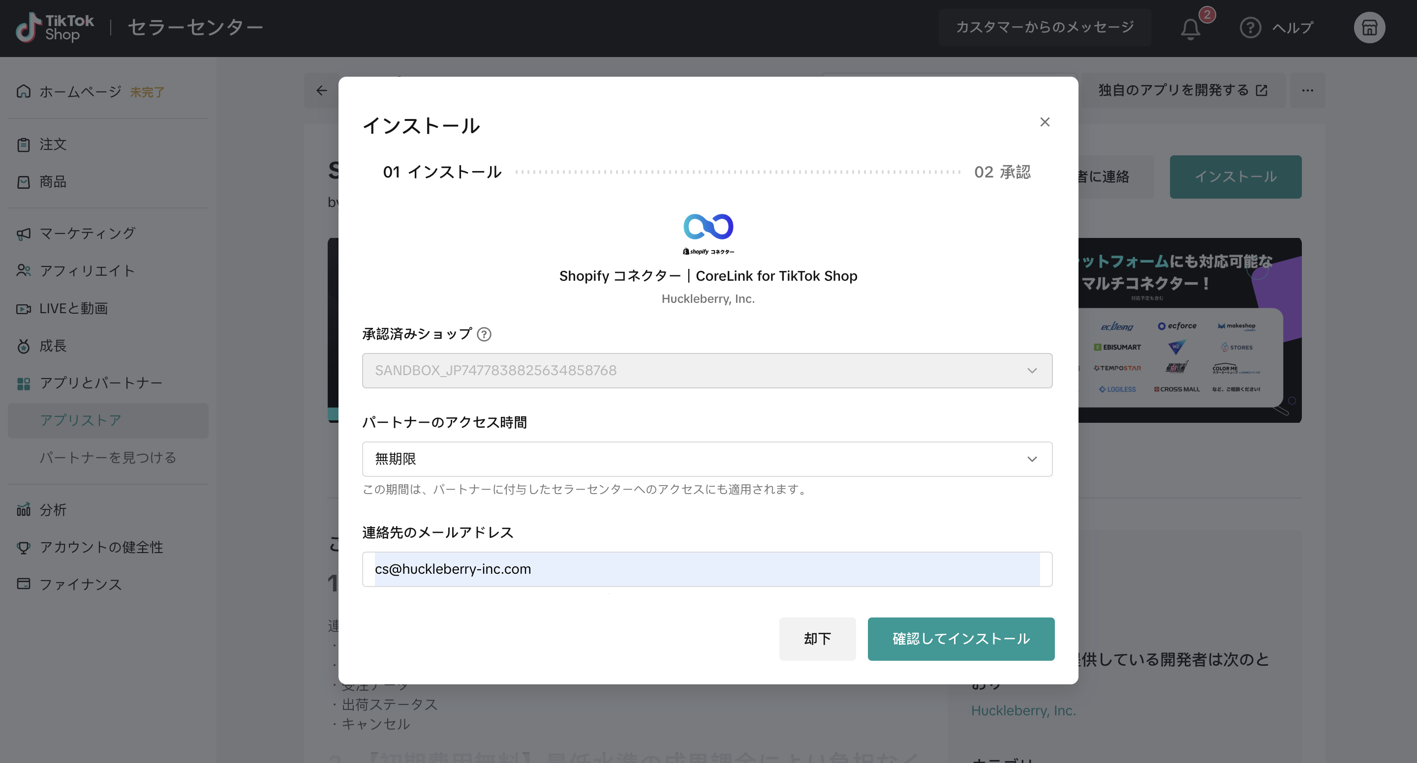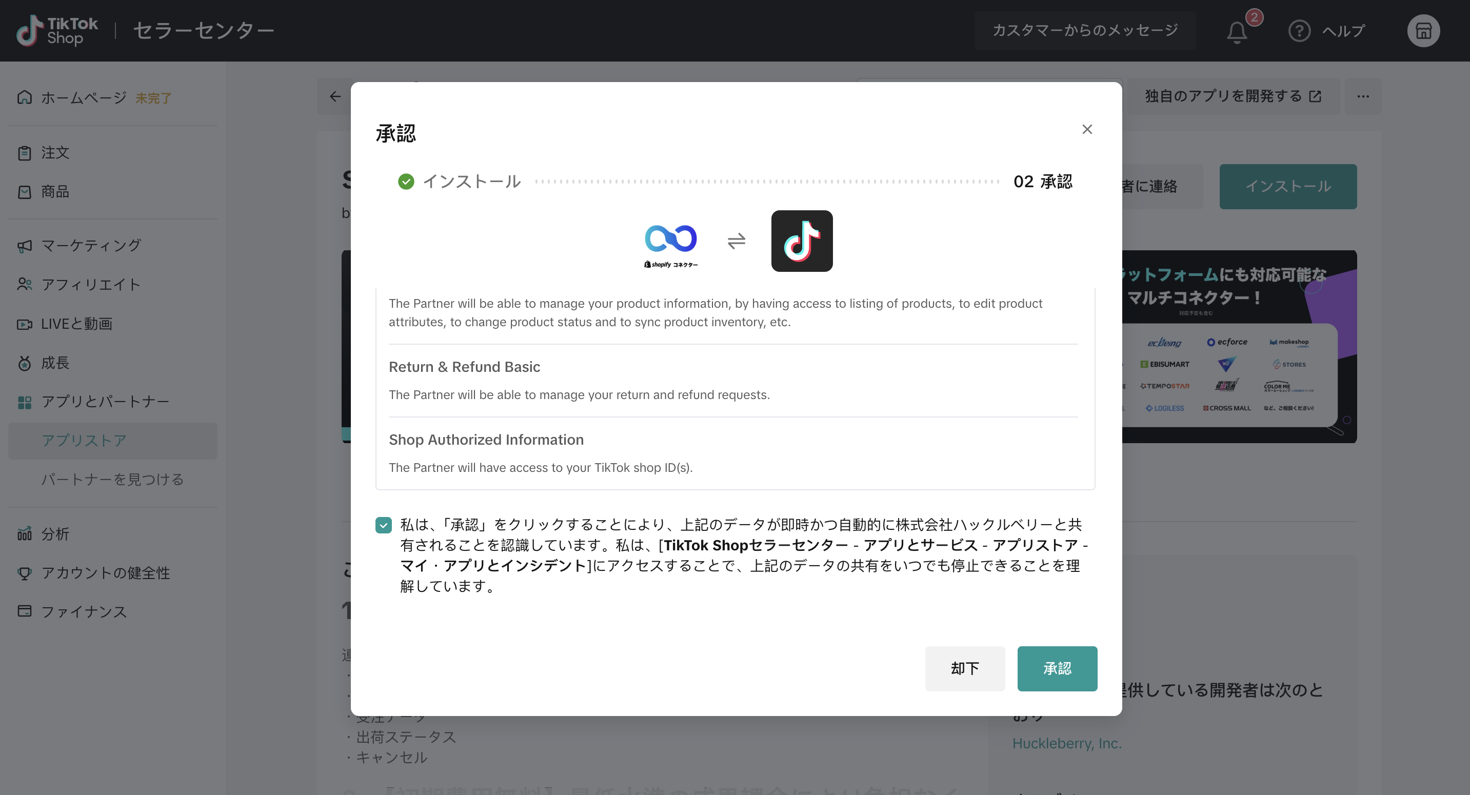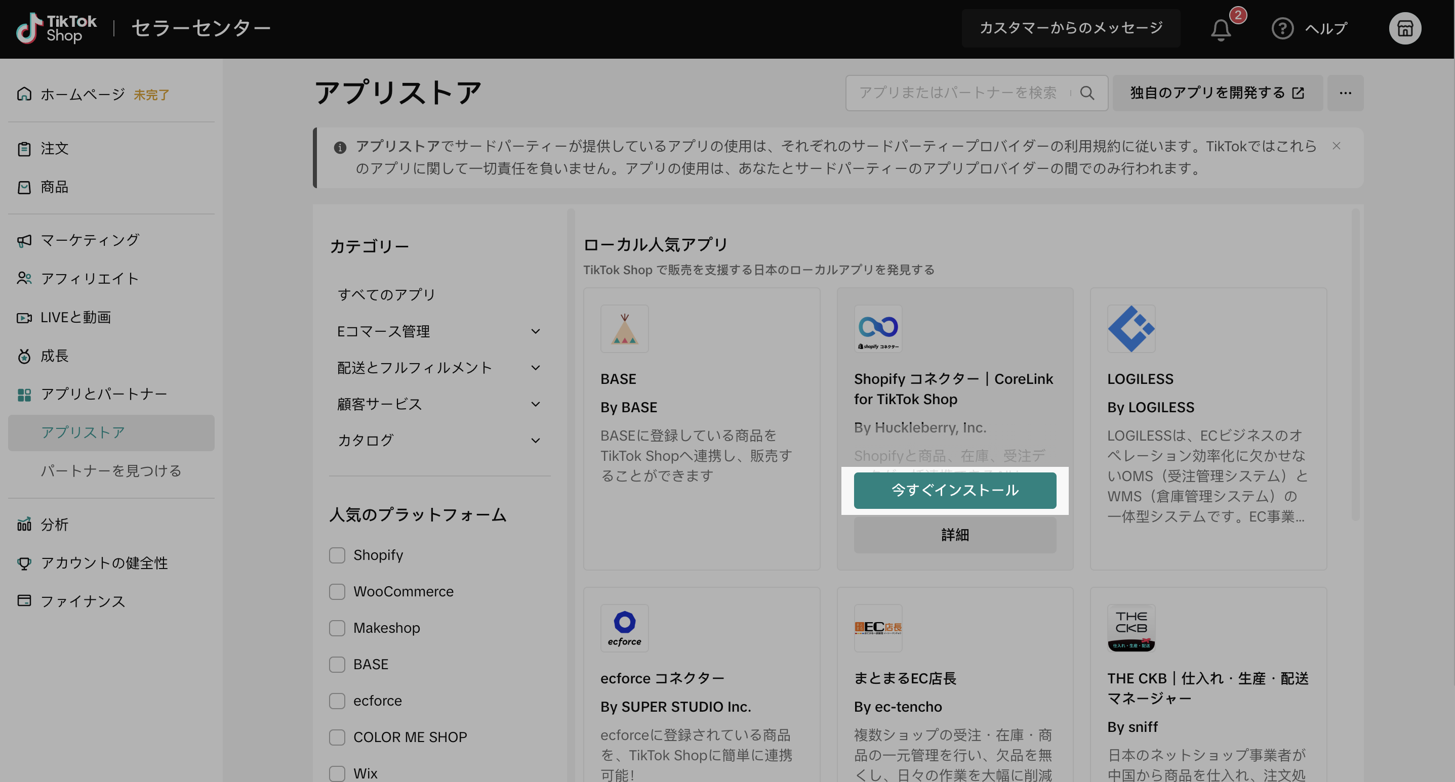 TikTok Shop セラーセンター「アプリストア」にて、