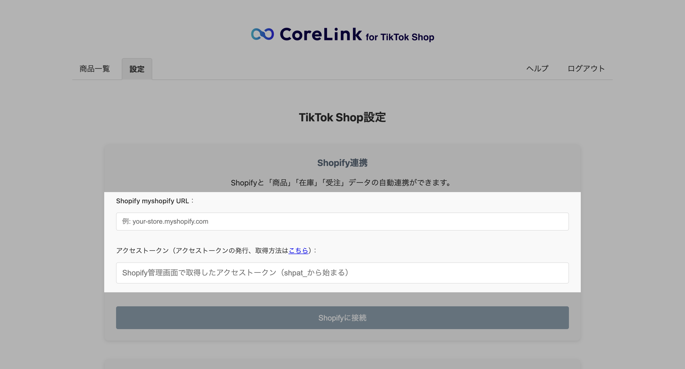 Shopify連携にて、myshopify URL・アクセストークンを入力し、Shopifyに接続をクリック