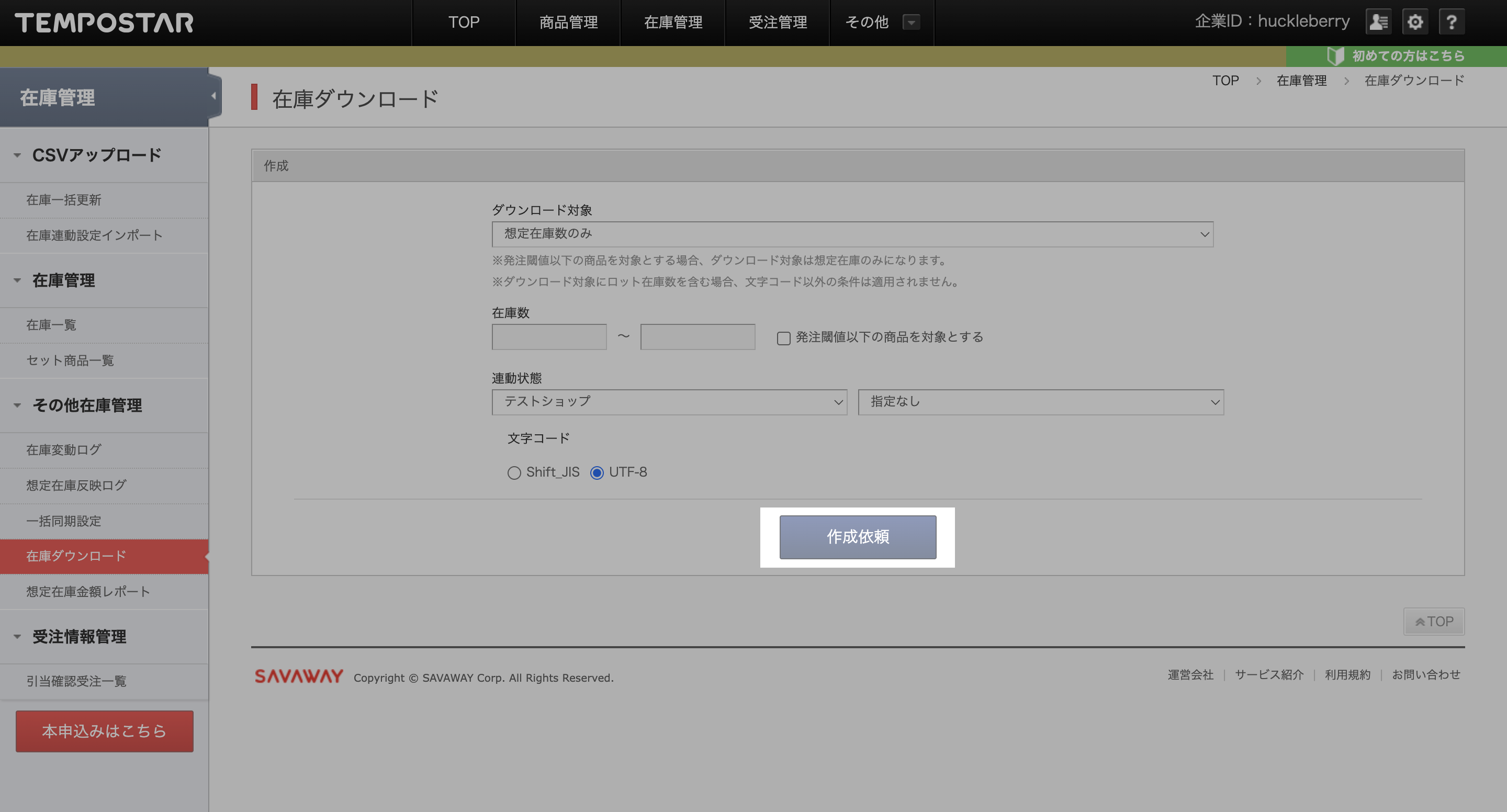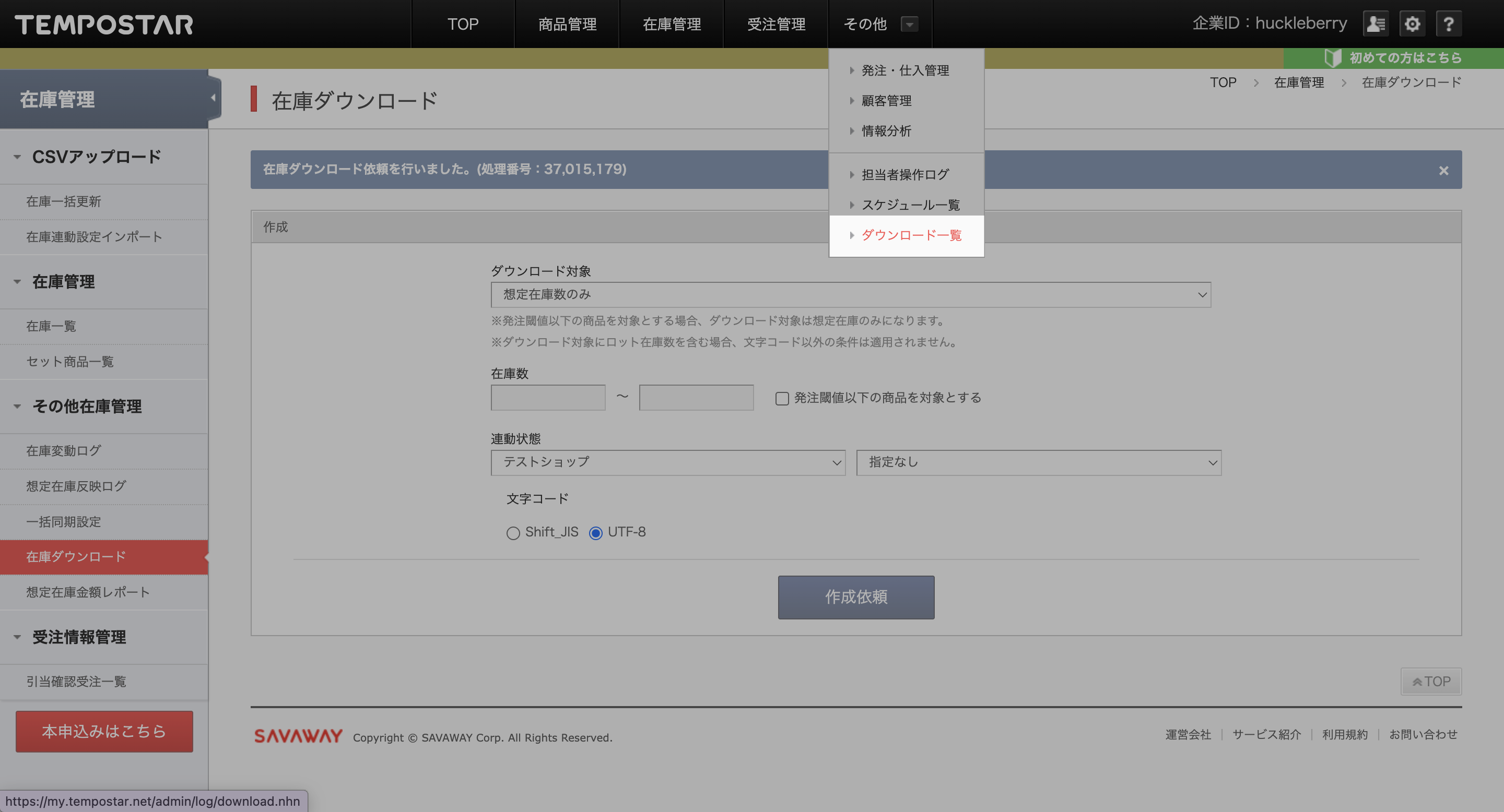 1. TEMPOSTAR管理画面「在庫管理」>「在庫ダウンロード」を開く