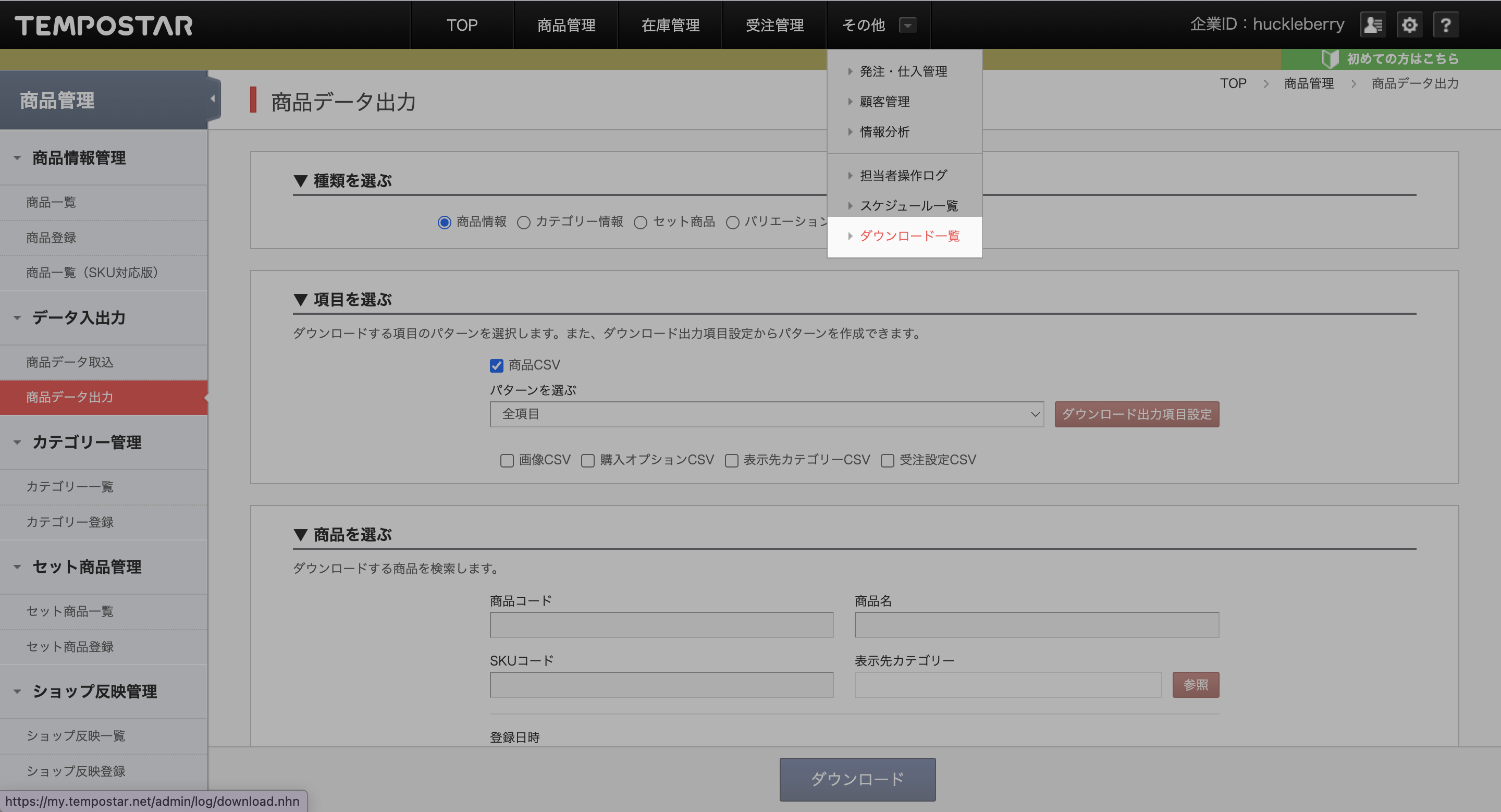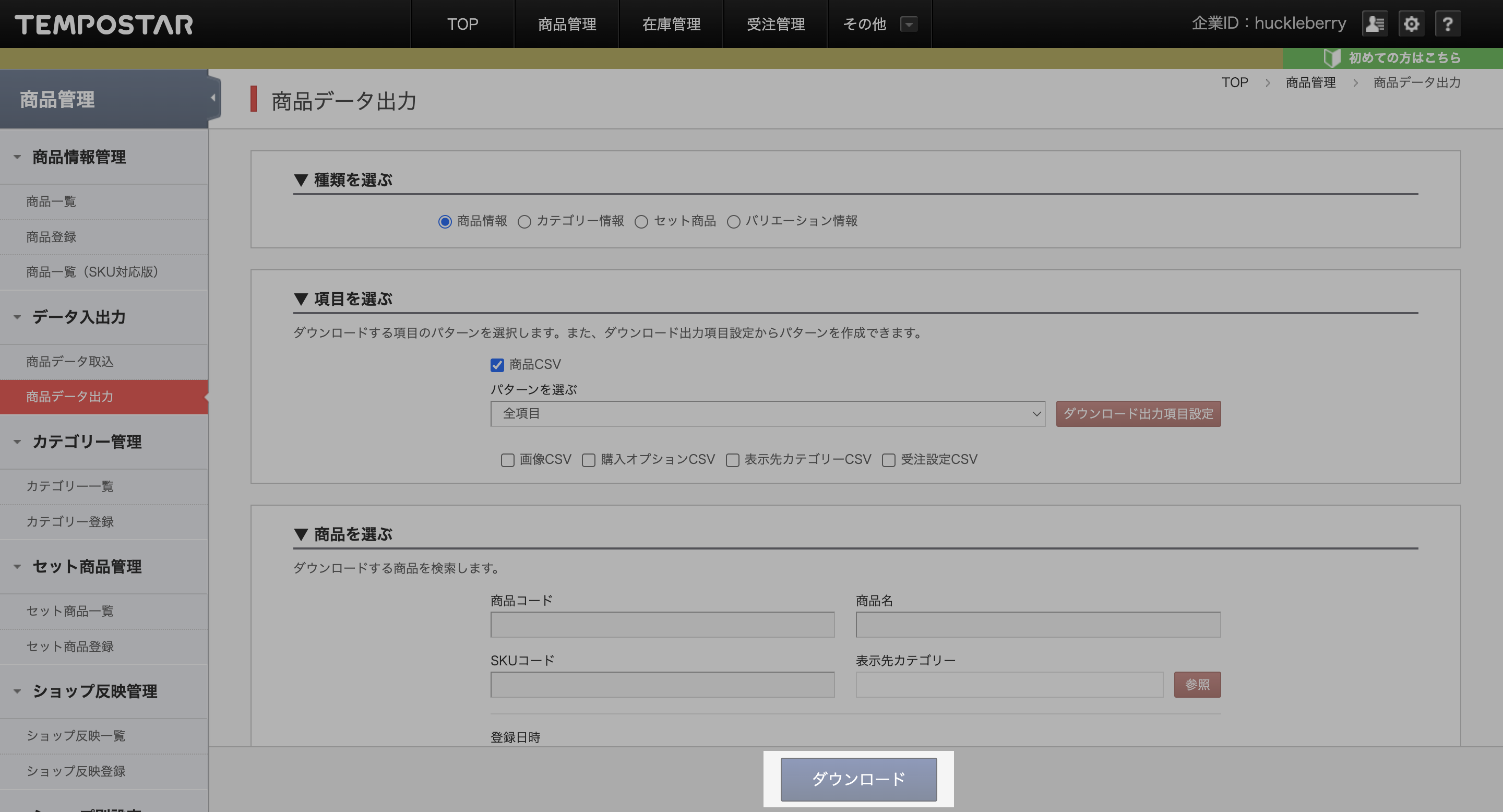TEMPOSTAR管理画面「商品管理」>「商品データ出力」を開き、