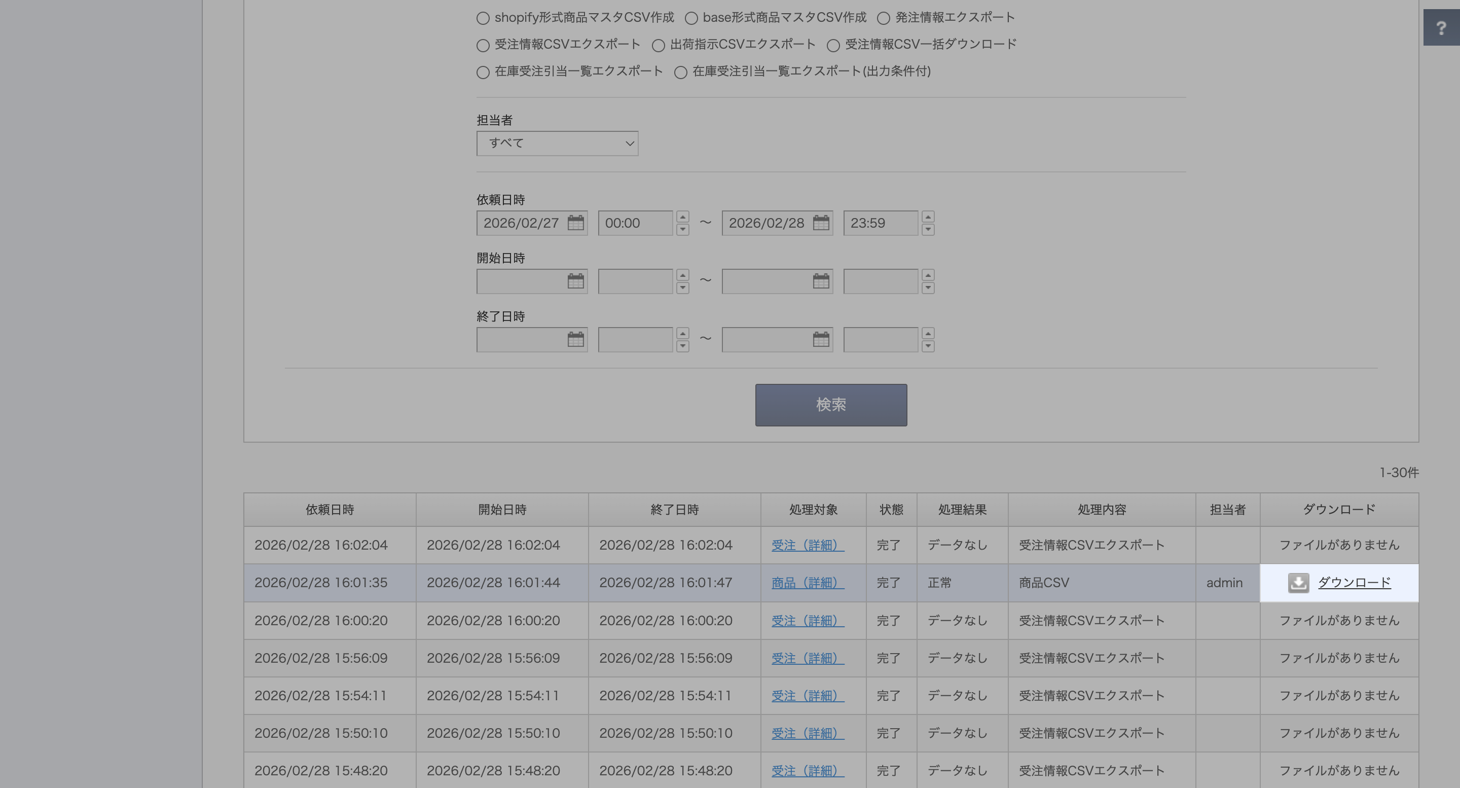 検索ボタンをクリックし、作成した商品CSVをダウンロードする