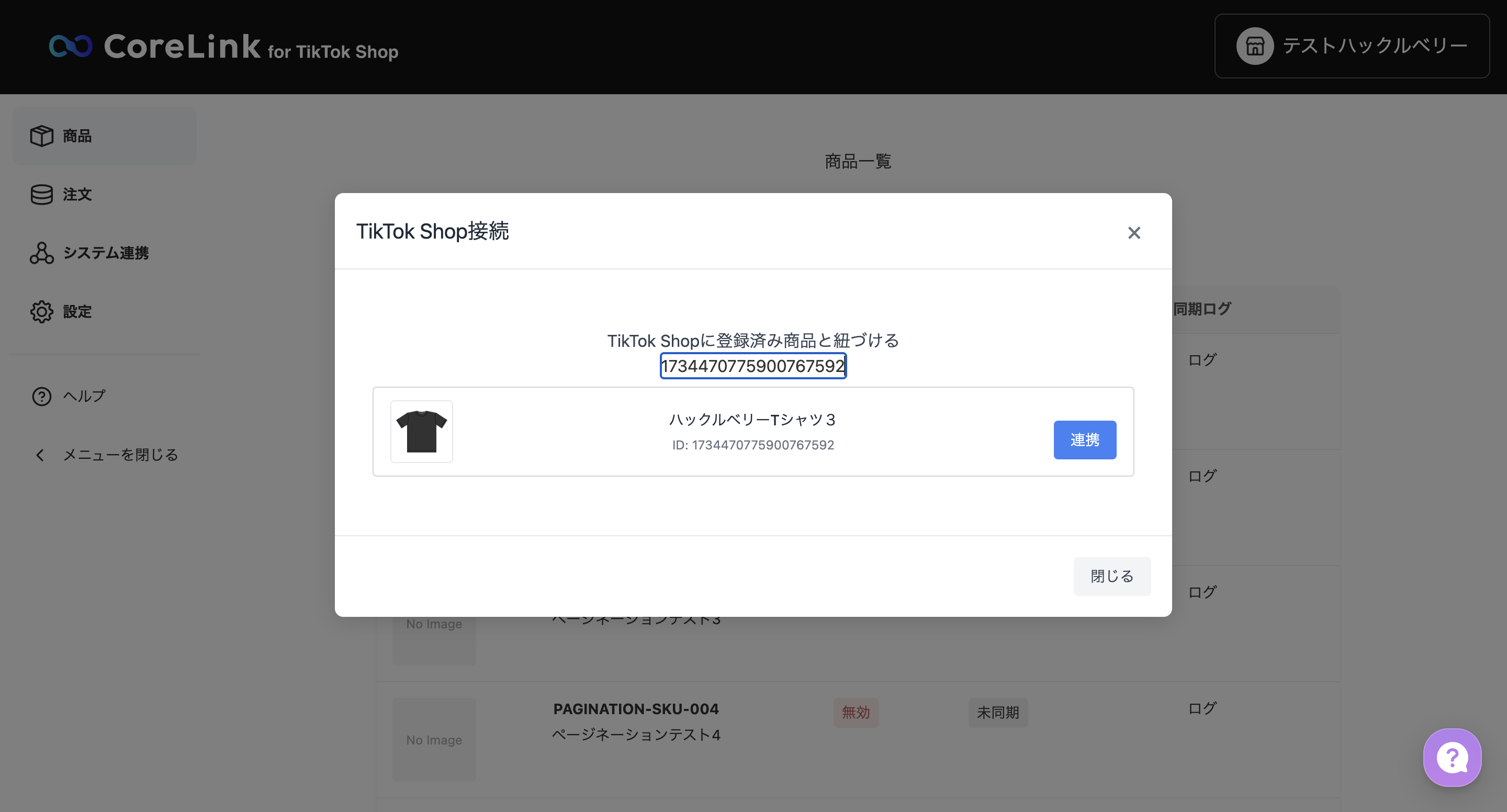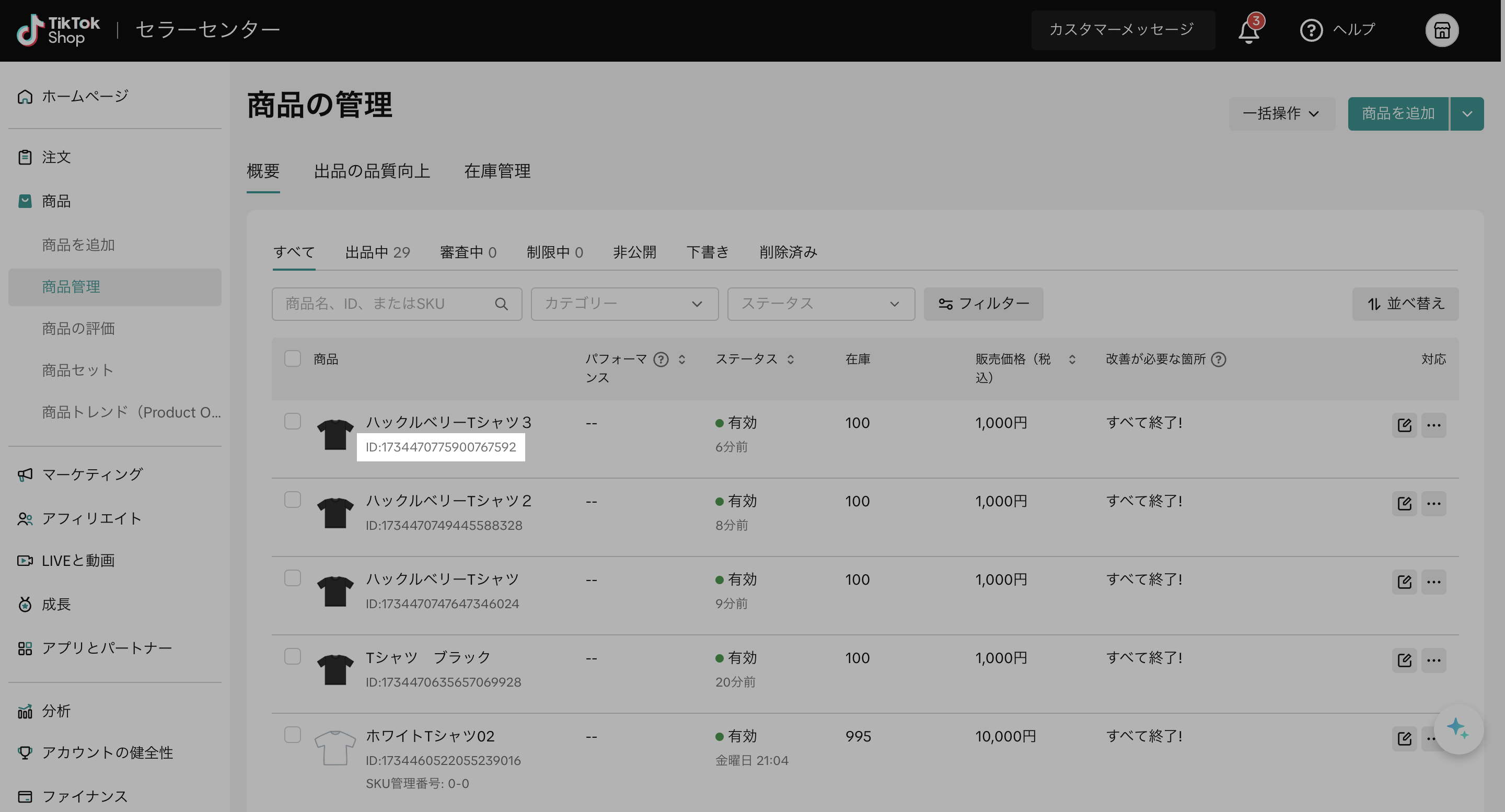 TikTok Shop セラーセンターにて、紐付けたい商品の「商品ID」をコピーする