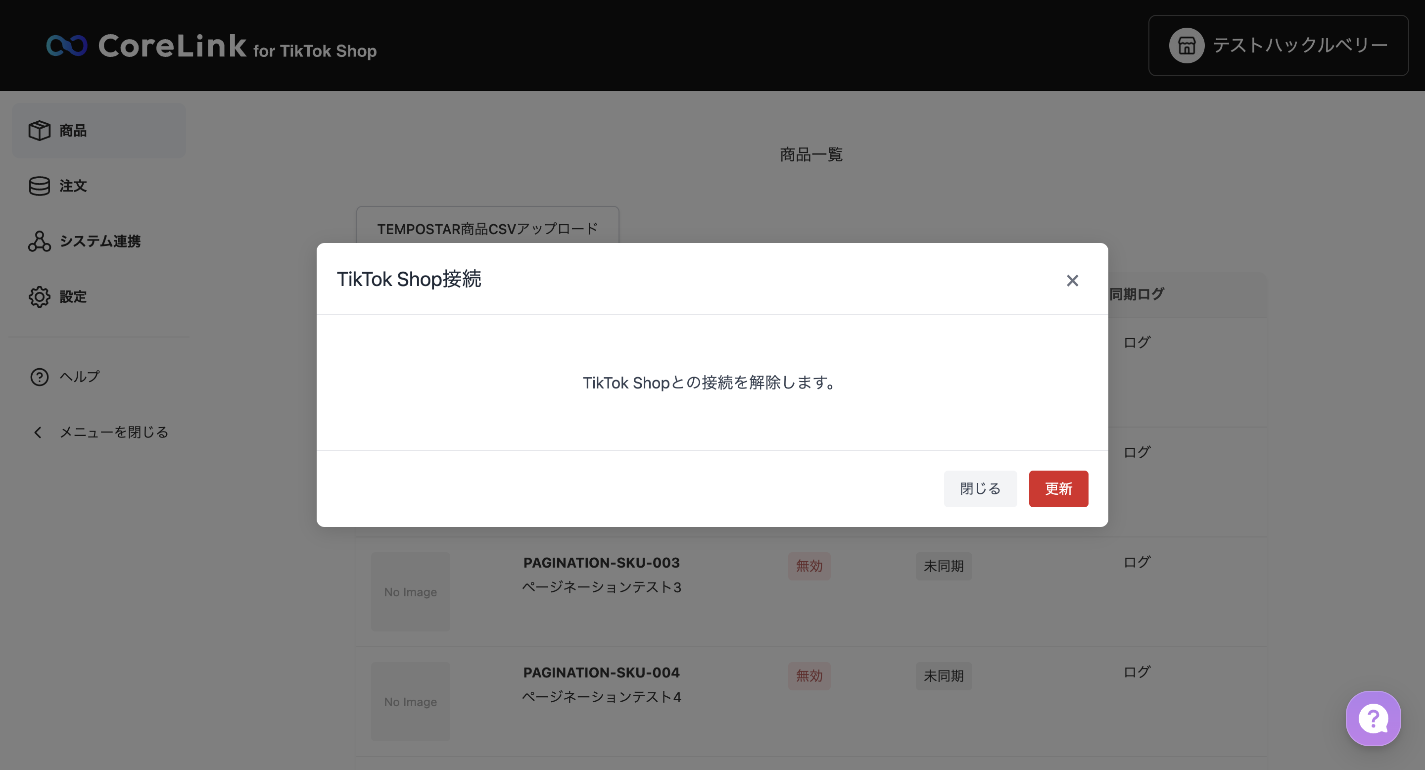 更新ボタンをクリック※連携を解除すると、商品の在庫同期が停止されます。