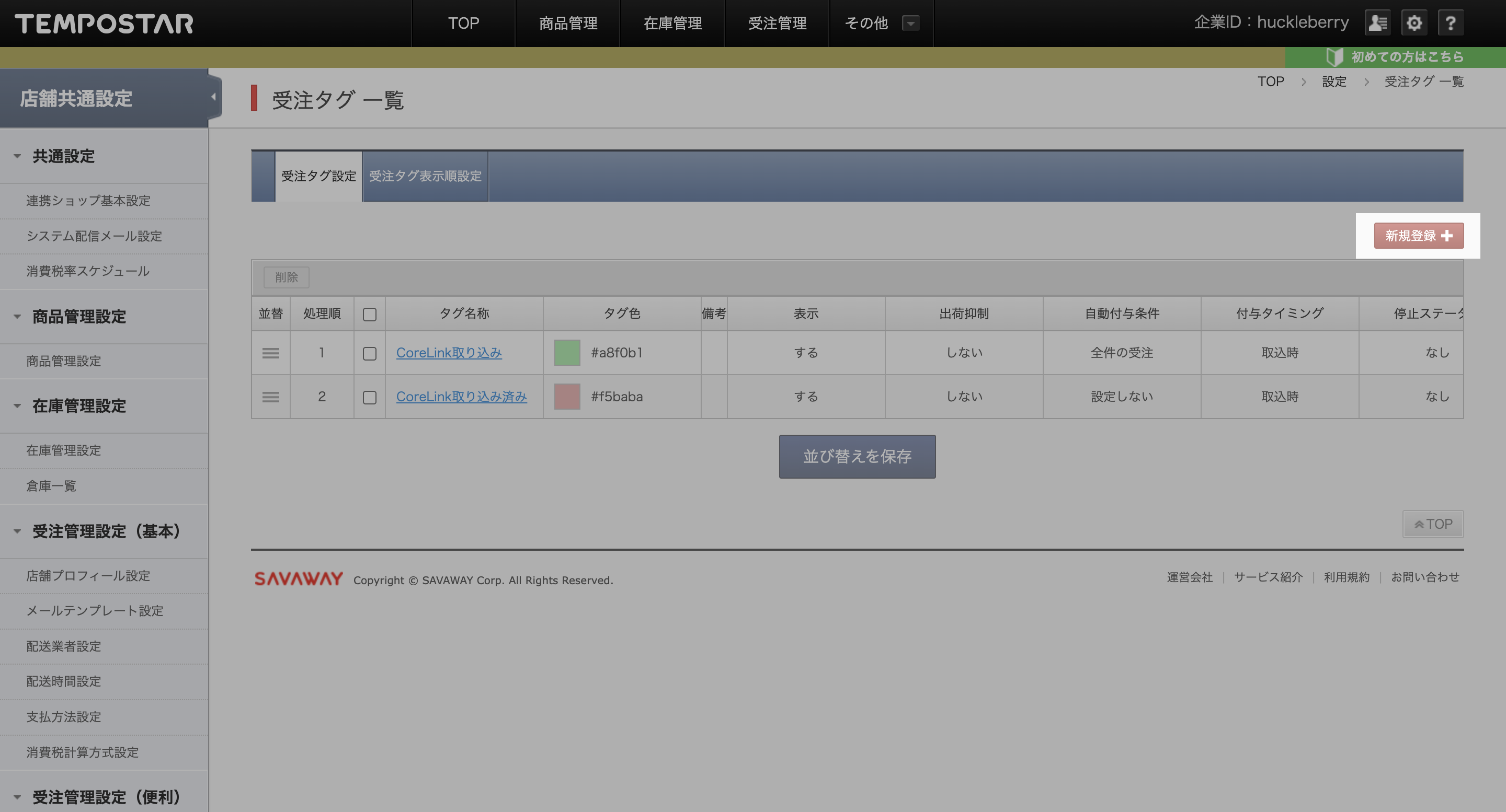 「設定」> 「受注タグ」より、