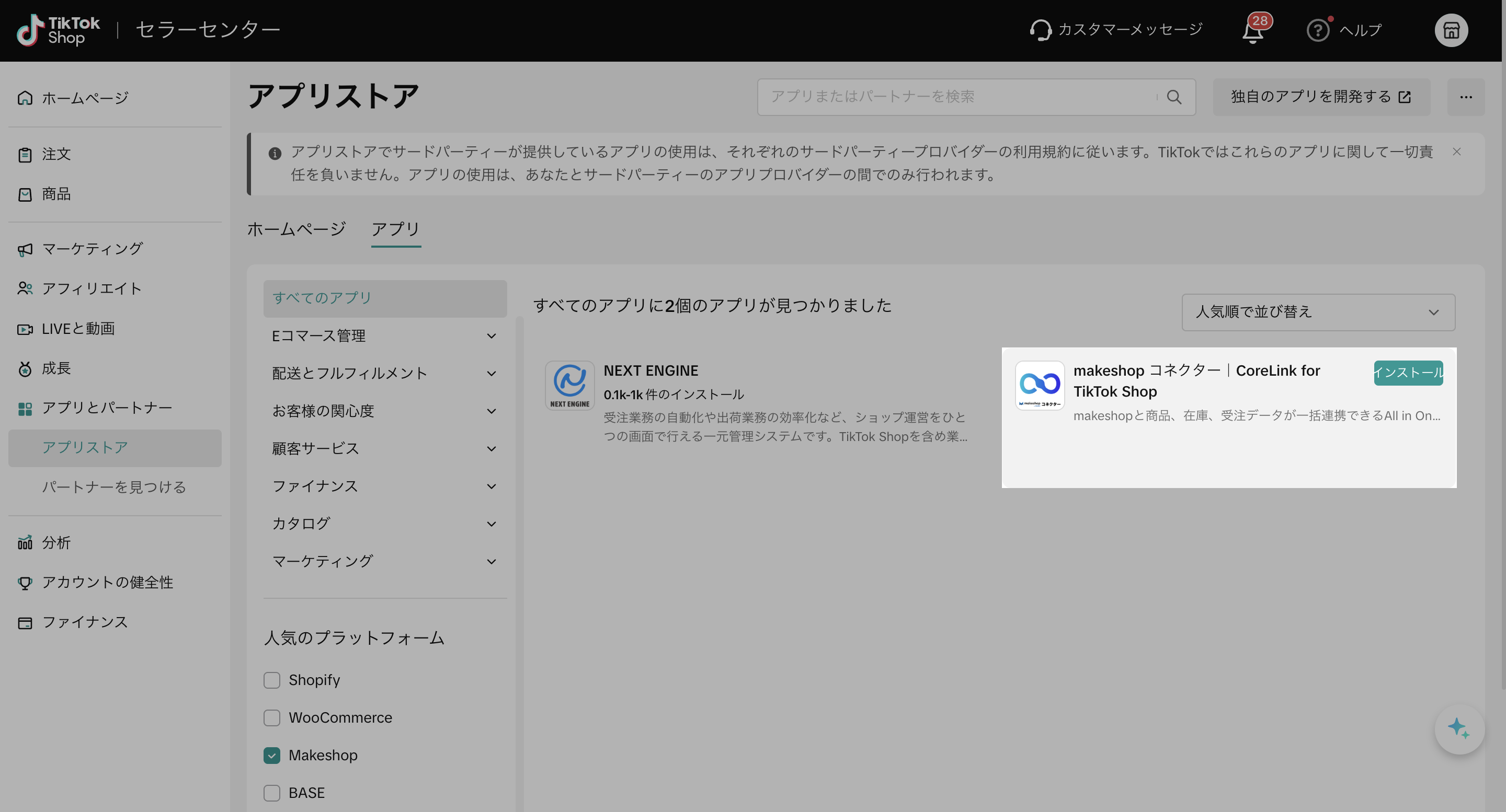 makeshop コネクター|CoreLink for TikTok Shopをインストール