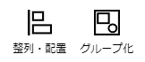 ①整列・配置…複数アイテムの整列、または用紙に対する配置を調整します。 ②グループ化…複数アイテムをグループ化します。選択時のみアクティブになります。