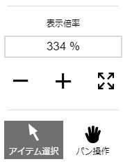 ①表示倍率…表示を拡大縮小します。 ②アイテム選択…アイテム選択モードにします。 ③パン操作…パン操作モードにします。