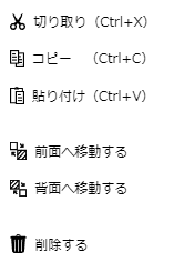 ①切り取り…選択したアイテムを切り取ります。(ショートカットキー…Ctrl+X) ②コピー…選択したアイテムをコピーします。(ショートカットキー…Ctrl+C) ③貼り付け…選択したアイテムを貼り付けます。(ショートカットキー…Ctrl+V) ④前面へ移動する…選択したアイテムを最前面へ移動します。 ⑤背面へ移動する…選択したアイテムを最背面へ移動します。 ⑥削除する…選択したアイテムを削除します。