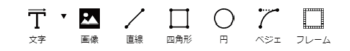①文字…文字を追加します。 ②画像…画像を追加します。 ③直線…直線を追加します。 ④四角形…四角形を追加します。 ⑤円…円を追加します。 ⑥ベジェ…ベジェを追加します。 ⑦フレーム…フレームを追加します。