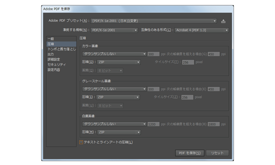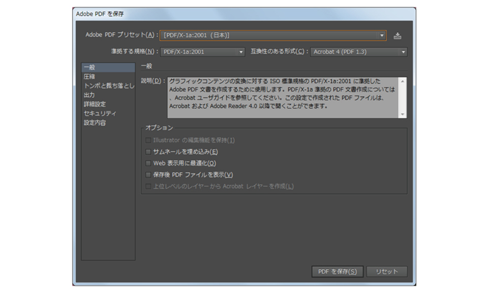 その他の設定は、Adobe PDFプリセットをPDF/X-1a:2001(日本)にしていれば変更する必要はありません。
