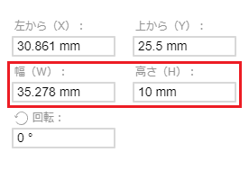 キャンバスの左上を基点(X:0mm、Y:0mm)として、文字枠の左上の位置を数値で表しています。Xの数値変更で横移動、Yの数値変更で縦移動します。