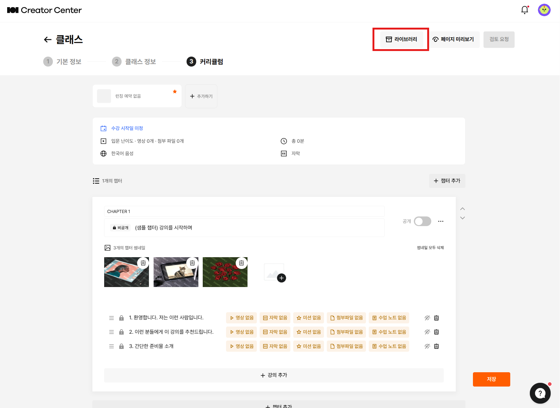 업로드 경로 : 크리에이터 센터 > 상품 > 전체 상품 > 해당 클래스 선택 > 커리큘럼 > 라이브러리