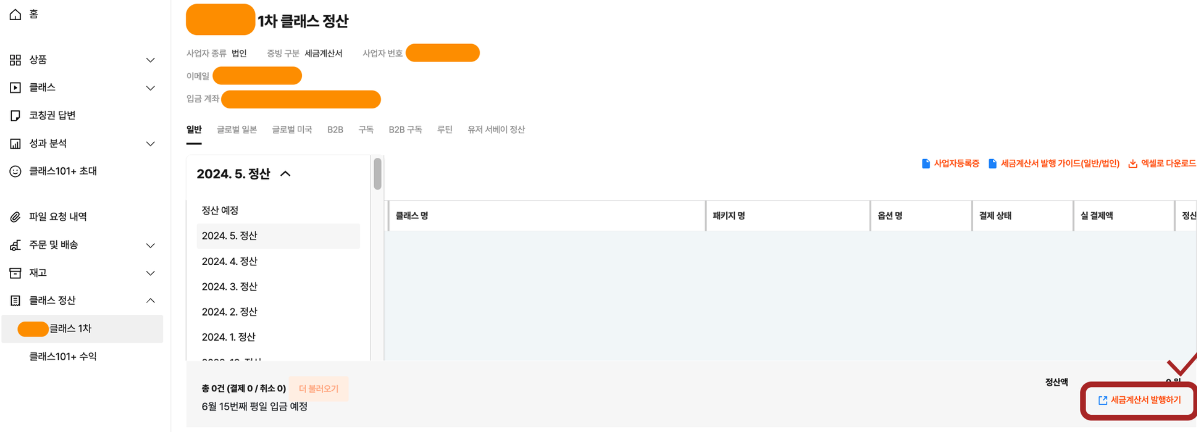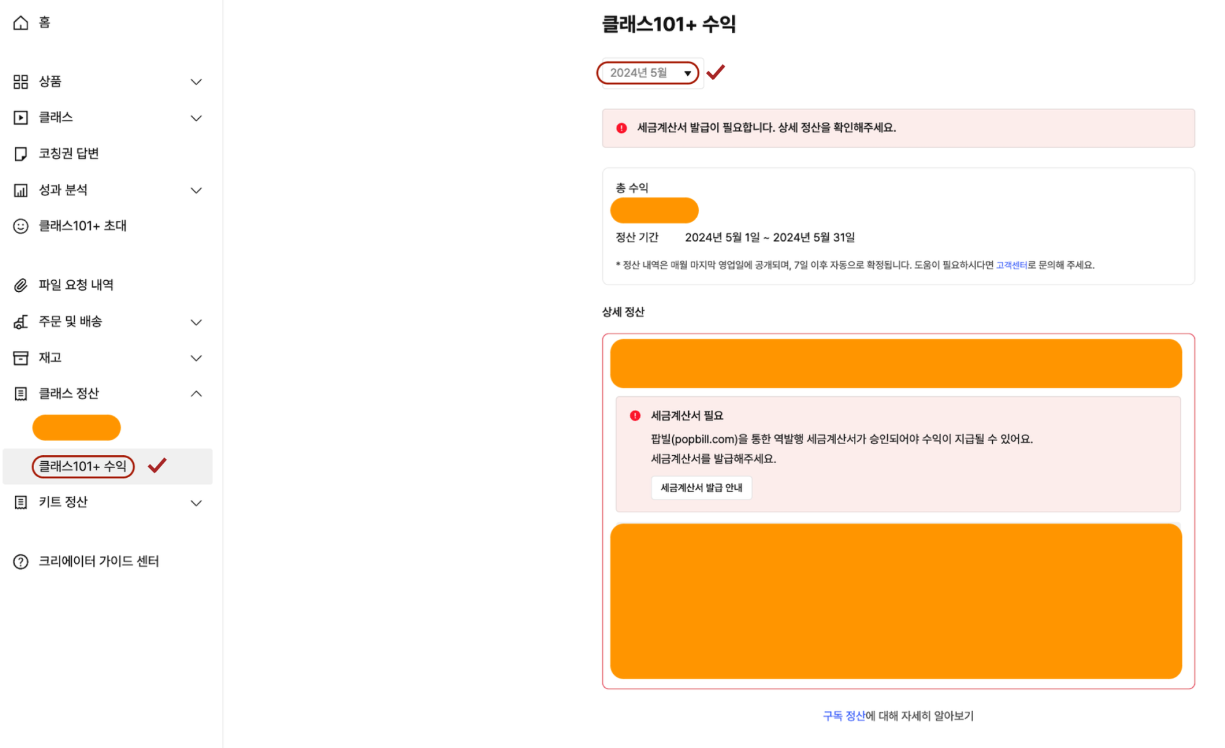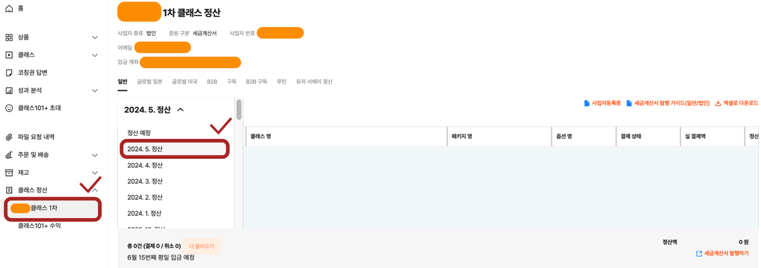 크리에이터 센터 → [클래스 정산] 또는 [키트 정산] 페이지로 이동합니다.